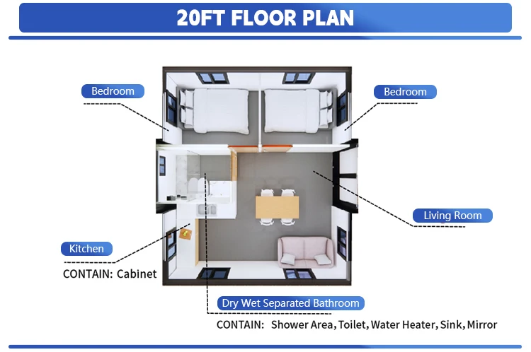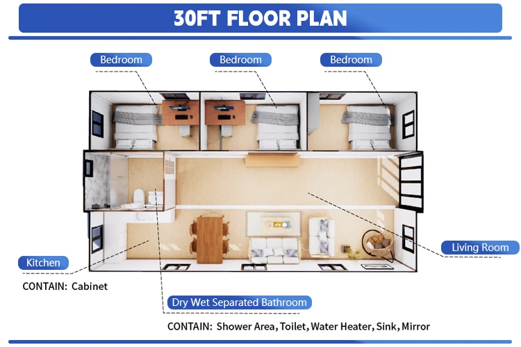 Casa contenitore prefabbricata per 3 camere da letto: piccole case da 20 piedi/40 piedi con cucina e bagno, colori e layout personalizzabili 1Casa contenitore prefabbricata per 3 camere da letto: piccole case da 20 piedi/40 piedi con cucina e bagno, colori e layout personalizzabili