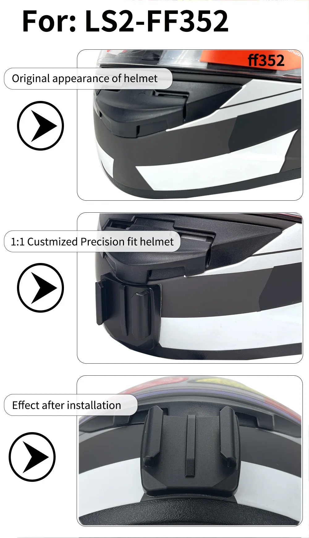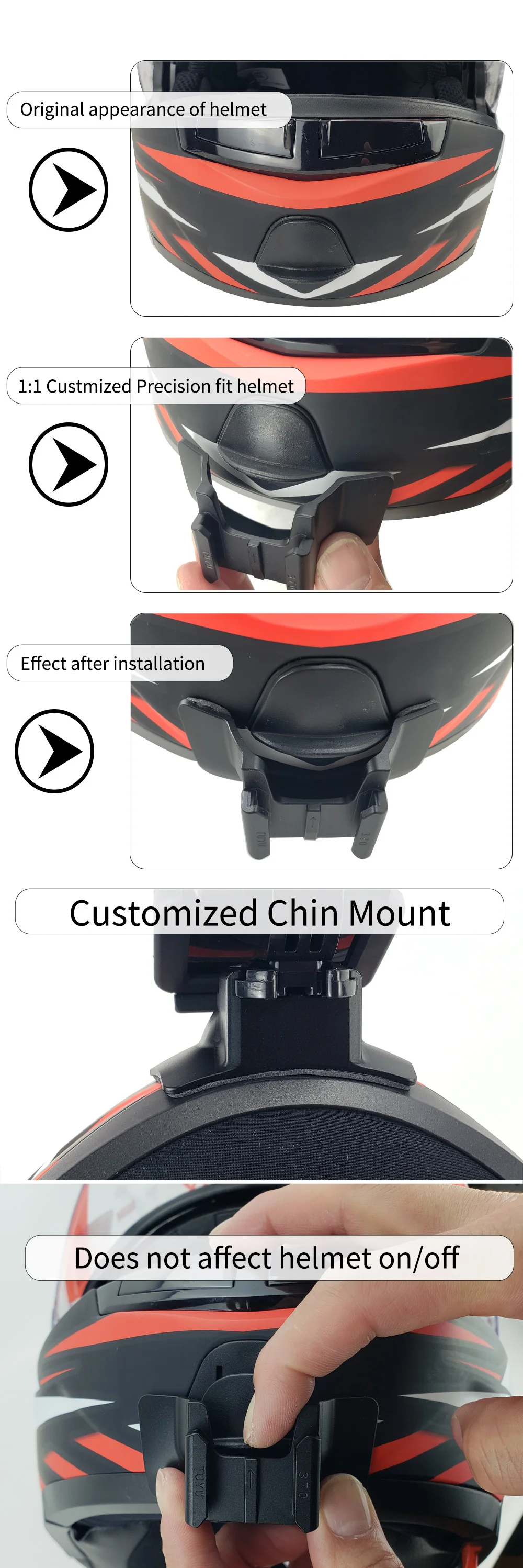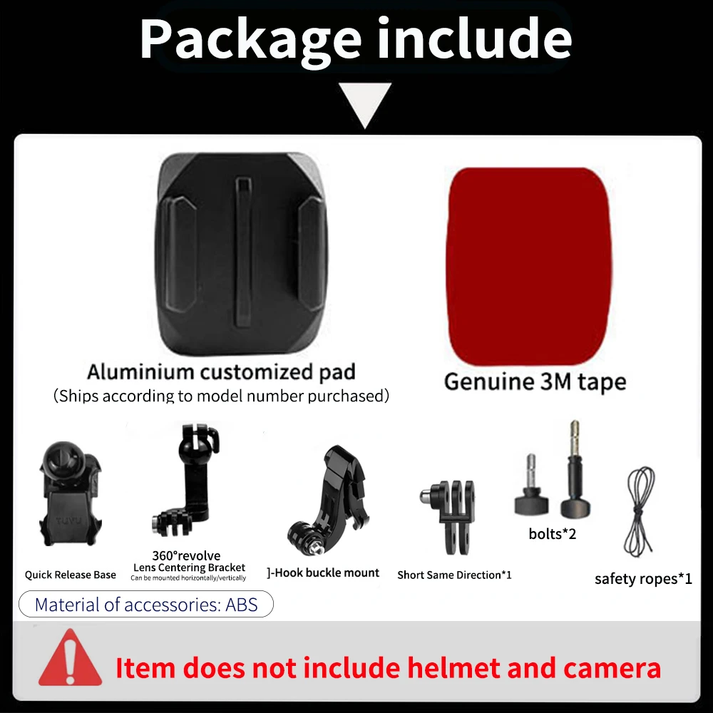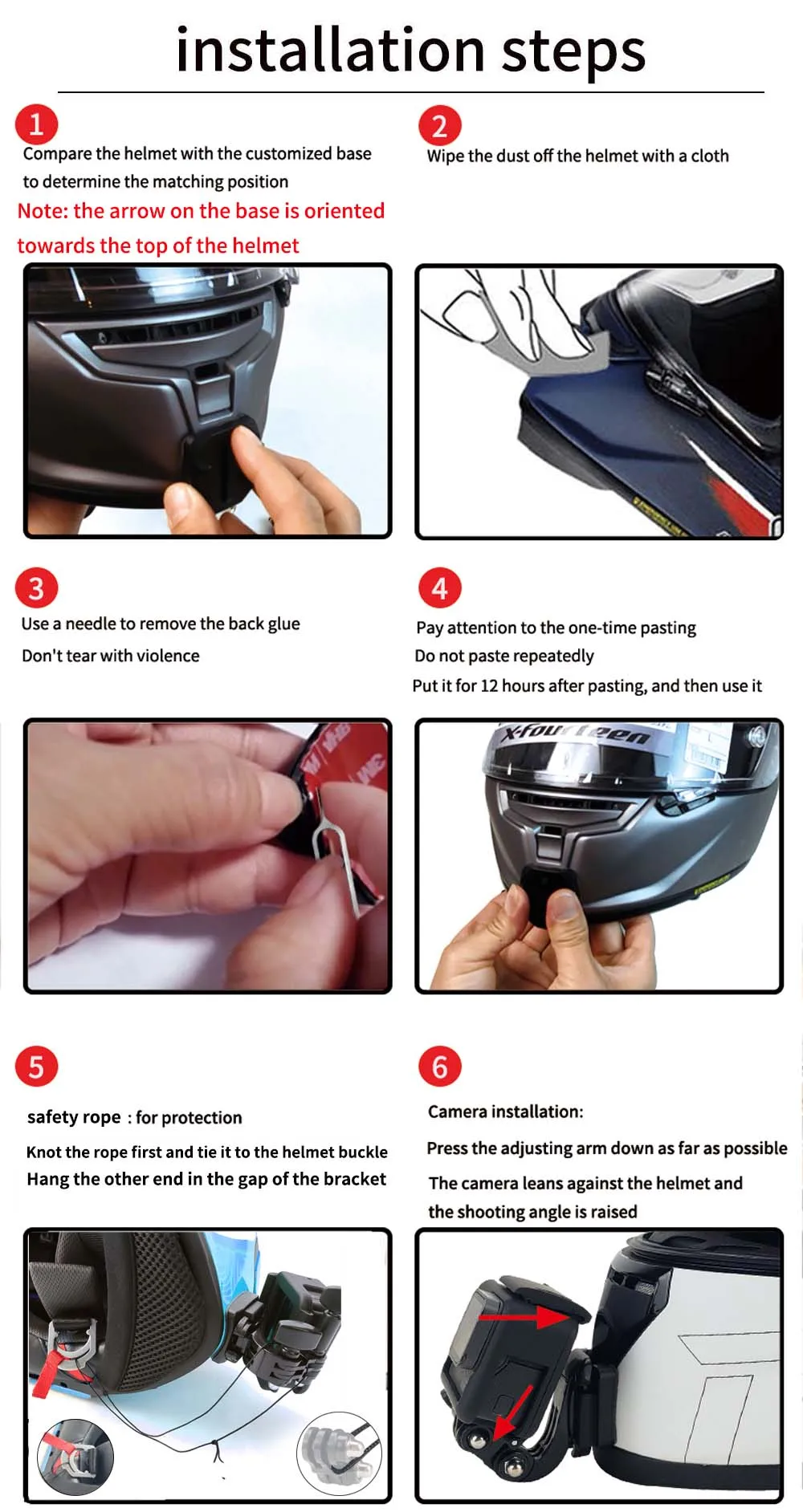 Nessun staffe o cinghie aggiuntive sono richieste dopo l’installazione e l’aspetto originale del casco è mantenuto tanto possibile.È solo bisogno di un autentico cuscinetto adesivo 3M per adattarsi saldamente.Il casco non è danneggiato dovuta a smontare e montare, e si adatta perfettamente.In aggiunta, la staffa non blocca l’interruttore della presa d’aria e la vestibilità è ferma.Dopo l’installazione è completa, agitare il gopro e scuotere il casco senza allentità.