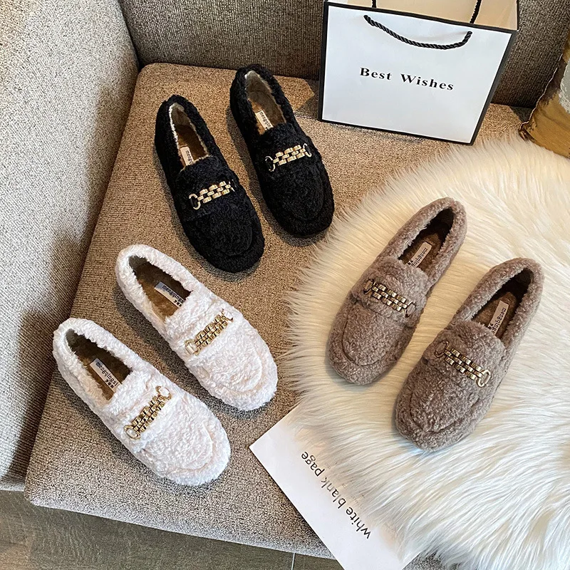 catene di design invernali mocassini in pelliccia con fibbia le donne mantengono calde calzature da esterno comode espadrillas in peluche scarpe pelose con plateau mujer
