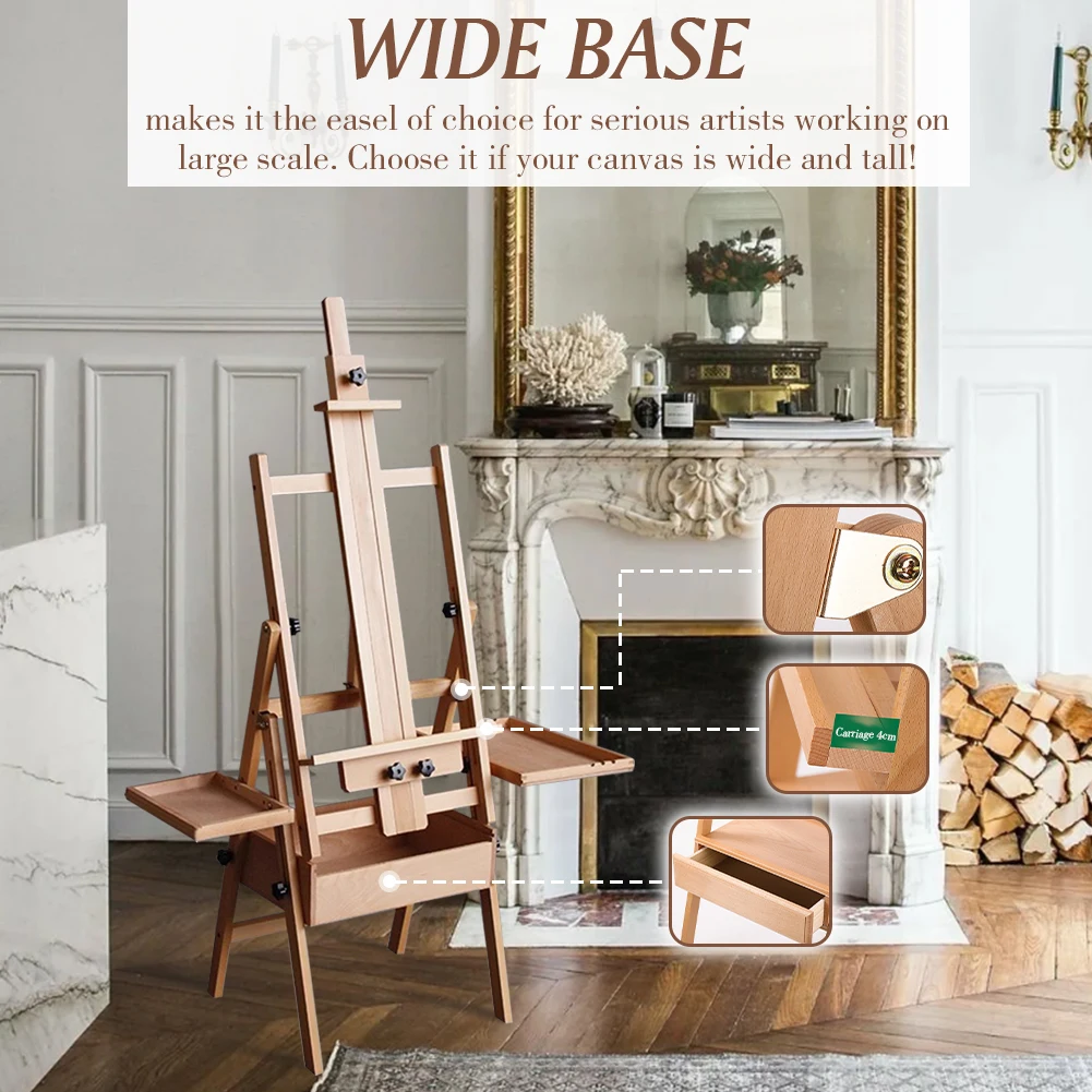 Cavalletto piatto pieghevole in faggio con vassoio per cassetti Supporto per pittura a olio Cavalletto regolabile pieghevole per pittura a olio per schizzi di bambini Caratteristiche: 1.Intervallo di altezza regolabile:Questo cavalletto multifunzionale offre un’altezza regolabile da 59 pollici (150 cm) a 81,5 pollici (207 cm), poiché può ospitare tele fino a 77 pollici (196 cm) di altezza quando inclinato verticalmente.È perfetto per gli artisti che lavorano su progetti su larga scala, offrendo flessibilità per soddisfare varie esigenze artistiche. 2.Costruzione premium in legno di faggio:Realizzato in legno di faggio liscio e lucido, questo cavalletto piatto pieghevole è progettato per artisti ambiziosi.Il suo design lussuoso ma pratico include una finitura trasparente leggera che ne esalta la bellezza naturale, rendendolo un’aggiunta elegante a qualsiasi spazio creativo. 3.Mobilità senza sforzo:Dotato di due grandi rotelle frontali, questo supporto per pittura a olio può essere facilmente spostato e bloccato in posizione.Che tu stia regolando il tuo spazio di lavoro o riposizionando il tuo progetto, la mobilità del cavalletto garantisce comodità e facilità d’uso, permettendoti di farlo concentratosulla tua arte. 4.Supporto su tela personalizzabile:Il tavolo da disegno cavallettoè dotato di aste regolabili in altezza e angolazione con tre cursori, che ti consentono di personalizzare l’installazione in base alle dimensioni della tua tela.Questa adattabilità garantisce che il cavalletto soddisfi le tue esigenze di verniciatura, supportando stabilità sia opere d’arte grandi che piccole. 5.Pacchetto completo:Realizzato a mano con cura, questo cavalletto regolabile pieghevole è dotato di una guida alle immagini chiara e di strumenti di assemblaggio, garantendo una configurazione senza problemi.La sua ampia posizione e l’ampia base lo rendono la scelta preferita per gli artisti seri che affrontano grandi creazioni, garantendo soddisfazione ad ogni utilizzo.
