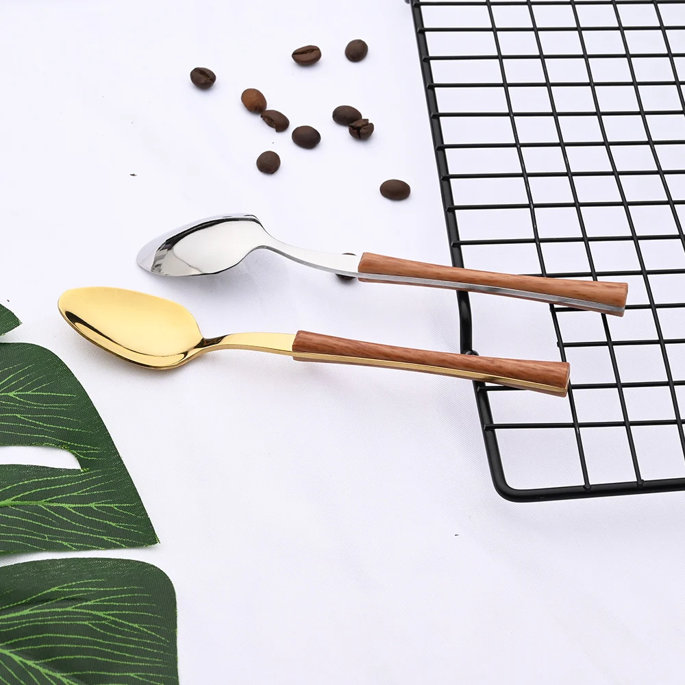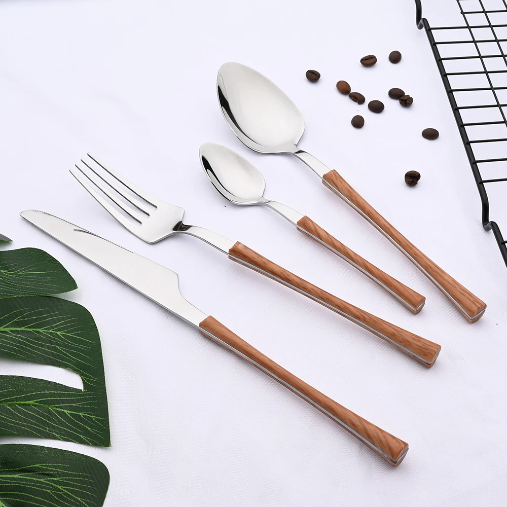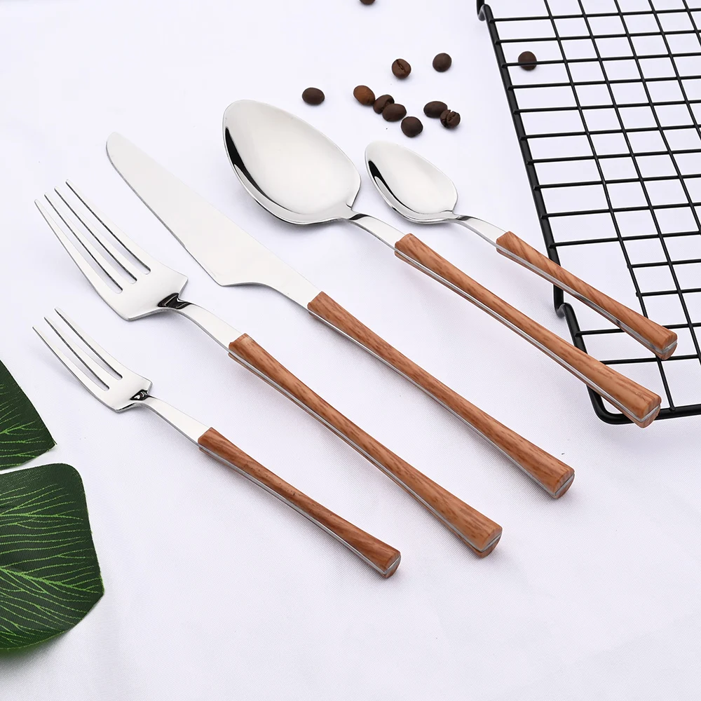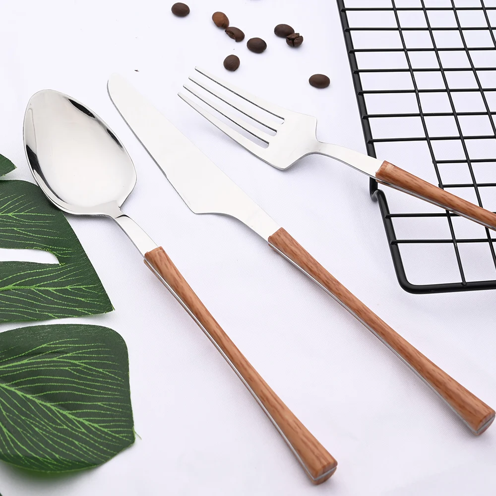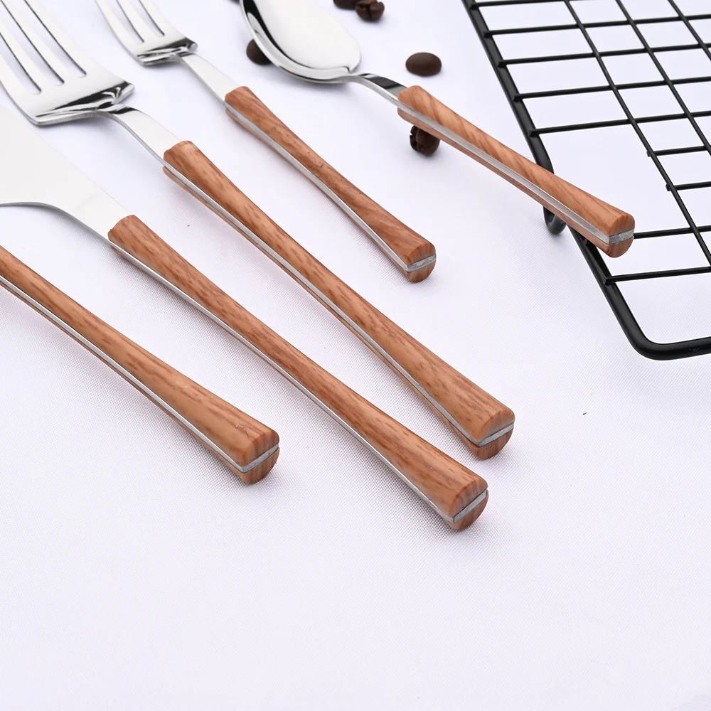 Cena argento acciaio inossidabile imitazione manico in legno coltello da tavola cucchiaino da caffè forchetta da tè Set di posate posate da tavola 1Cena argento acciaio inossidabile imitazione manico in legno coltello da tavola cucchiaino da caffè forchetta da tè Set di posate posate da tavola
