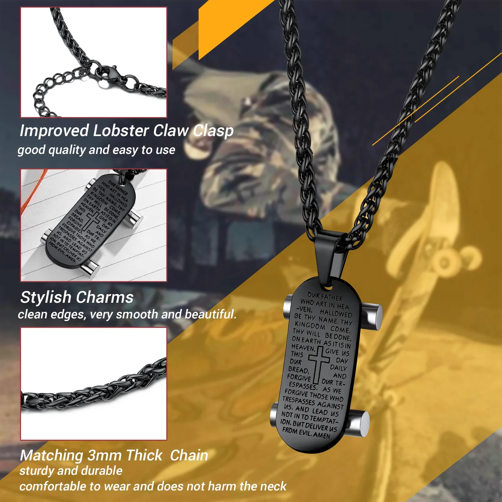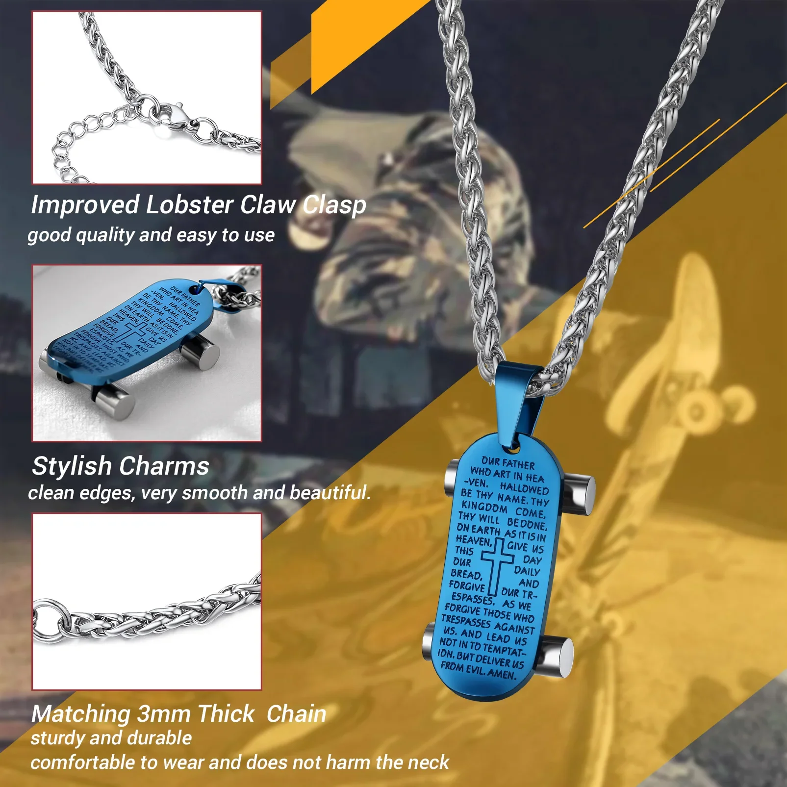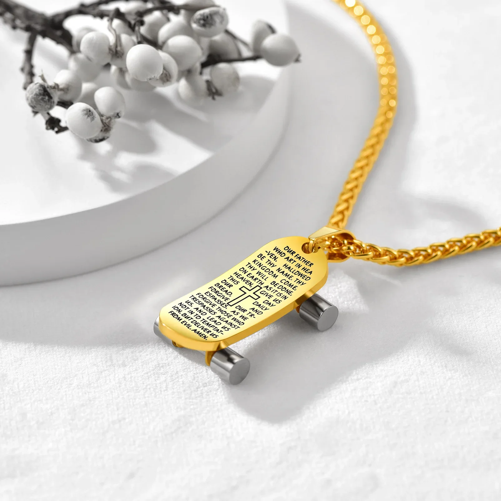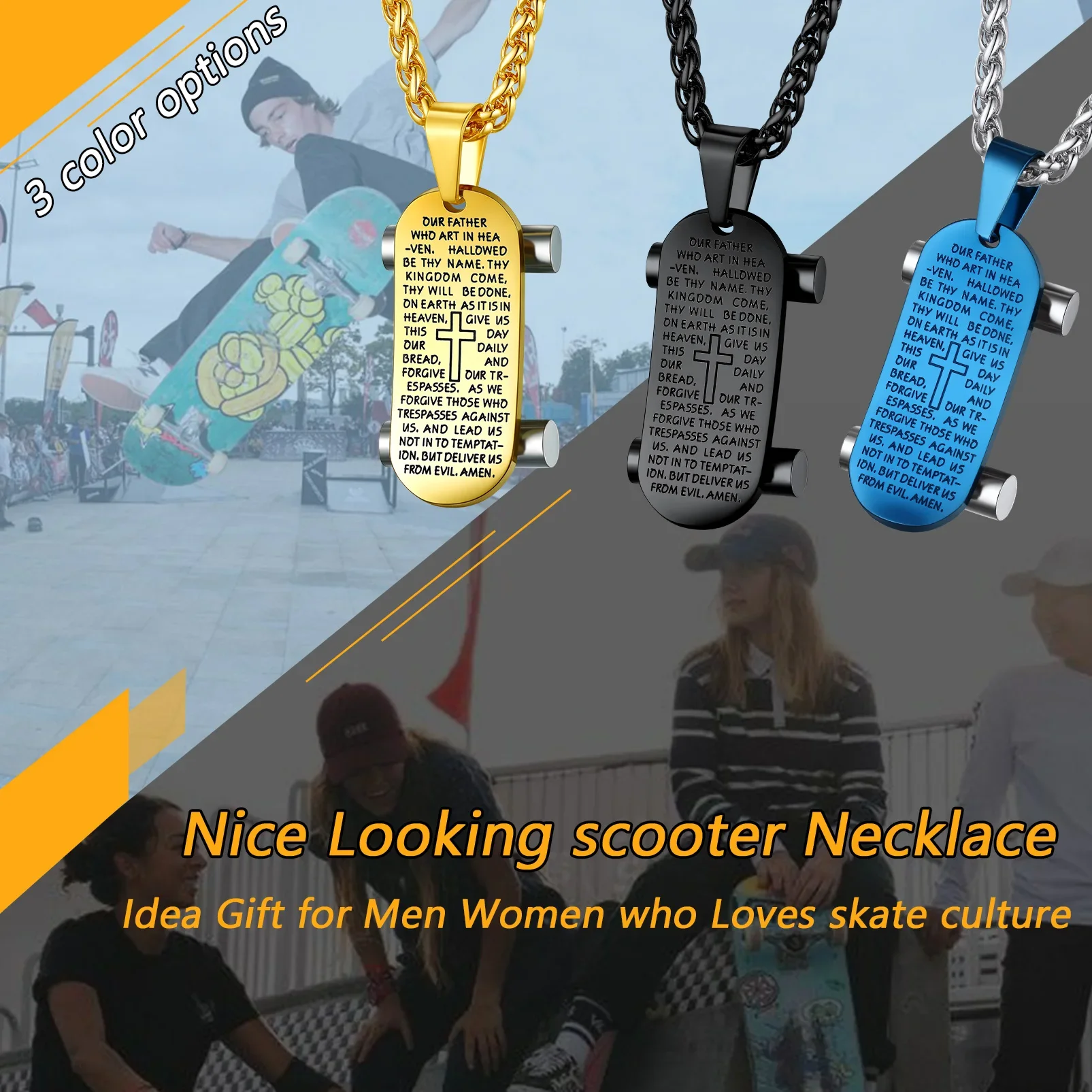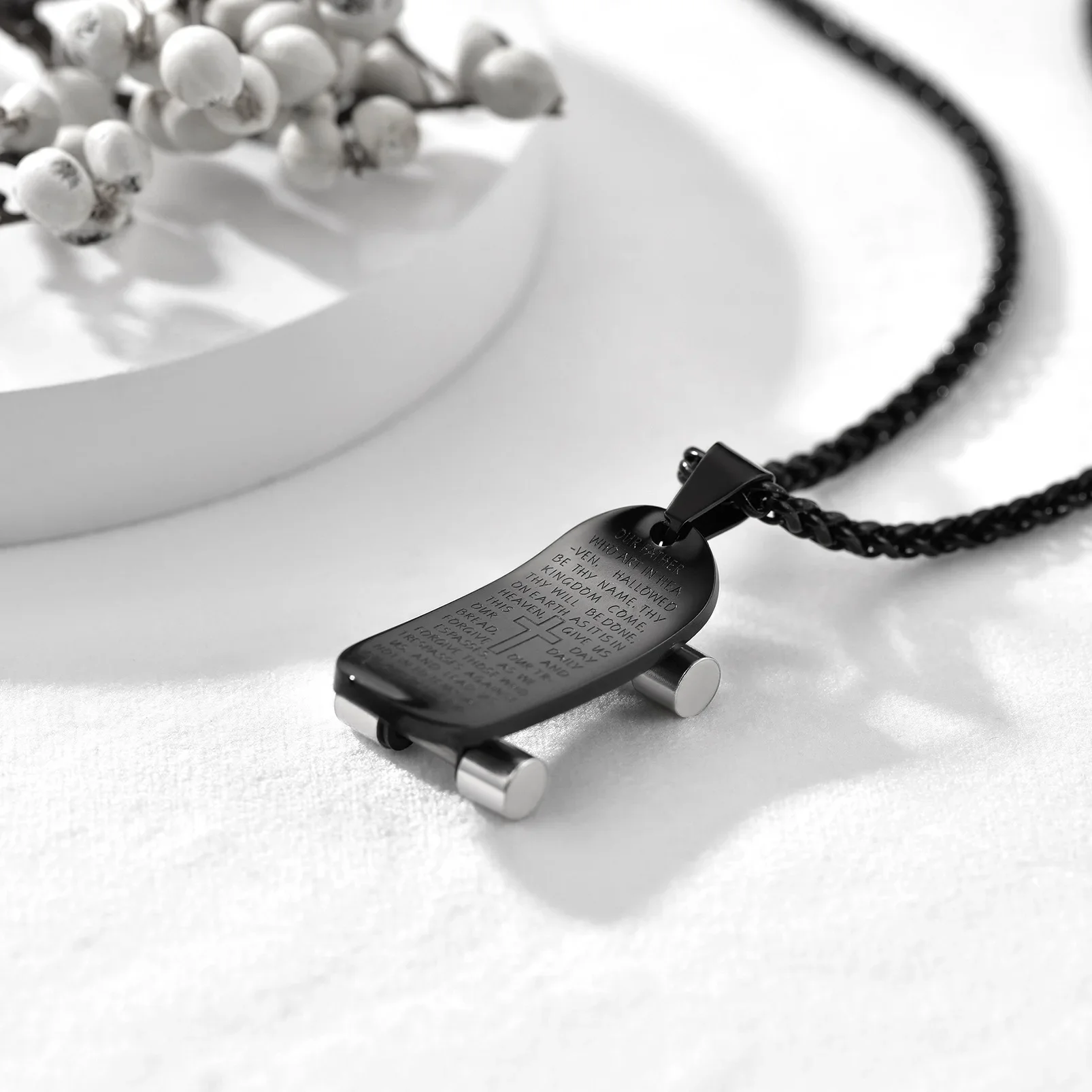 A cool skateboard biker pendant necklace: Inspiring Bible verses are engraved on the skateboard. You will be the focus when you are using it! The Christian catholic the lord’s prayer is a magical pattern. This unique cross scripture skateboard necklace can bring good luck to the wearer and make the wearer braver.