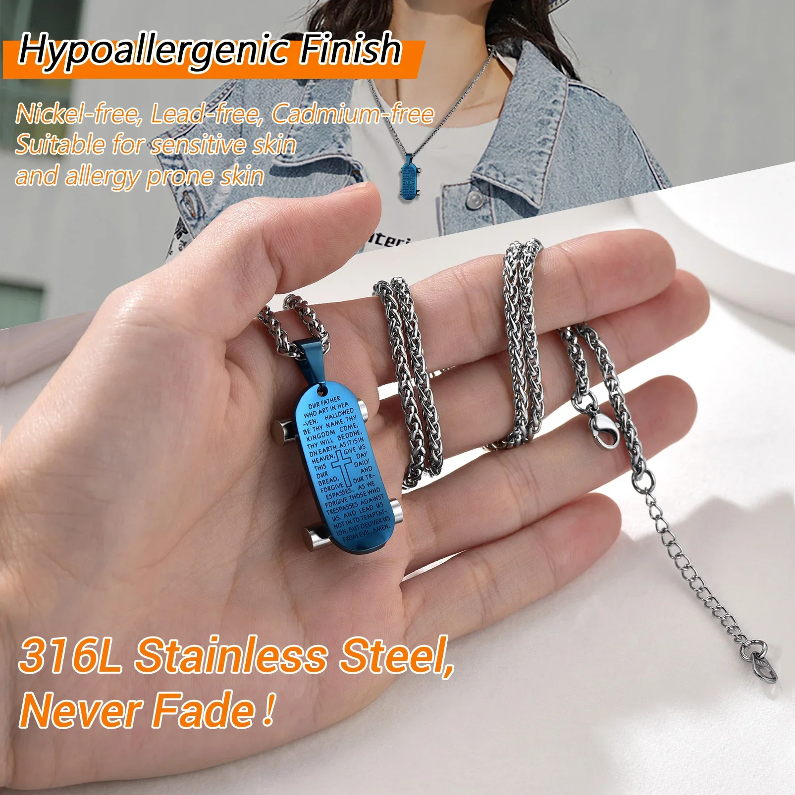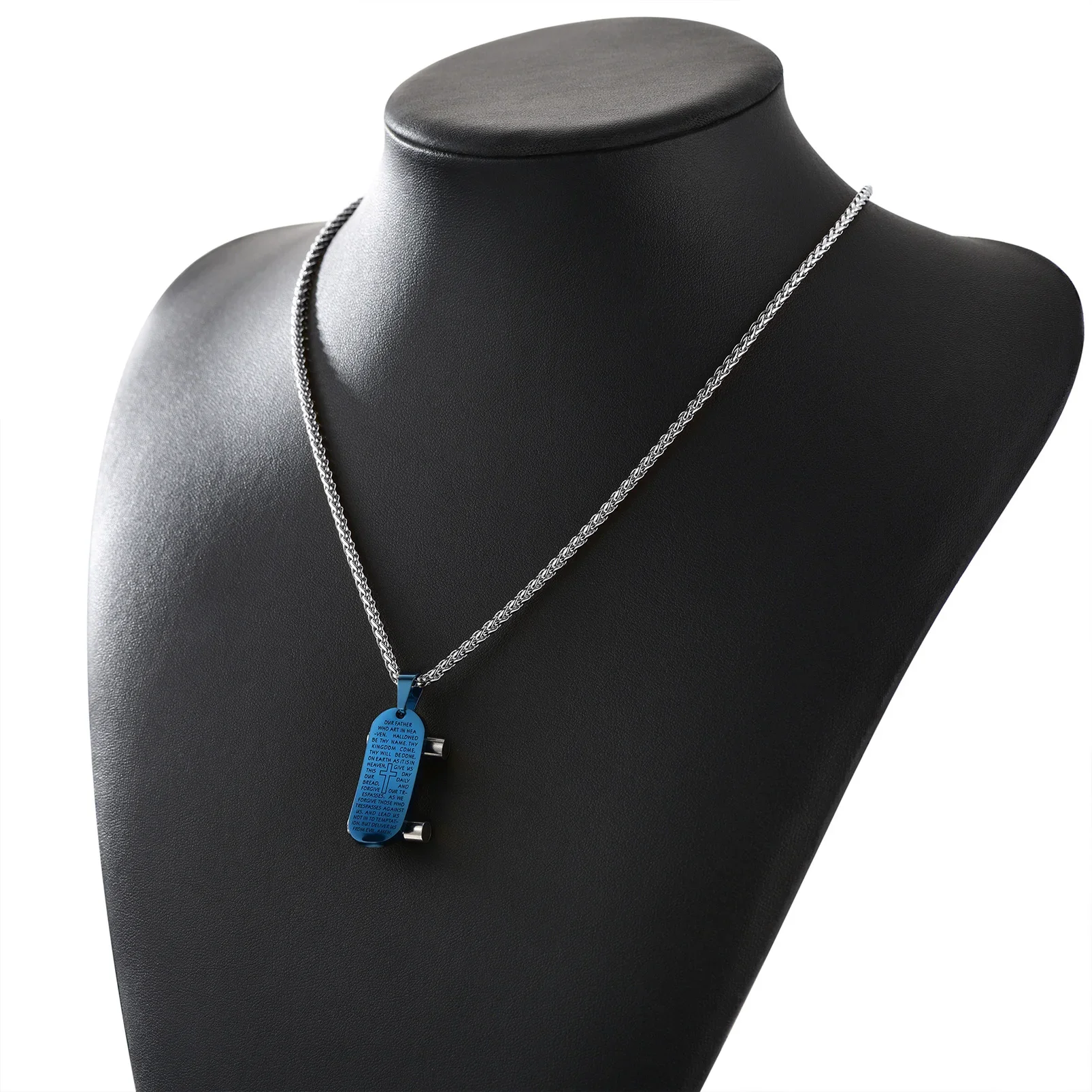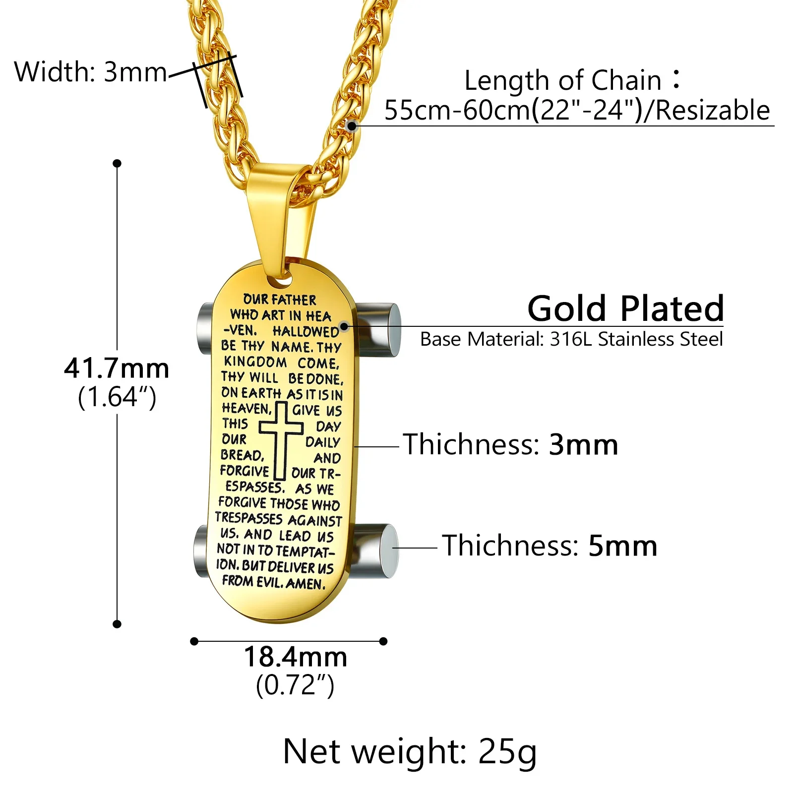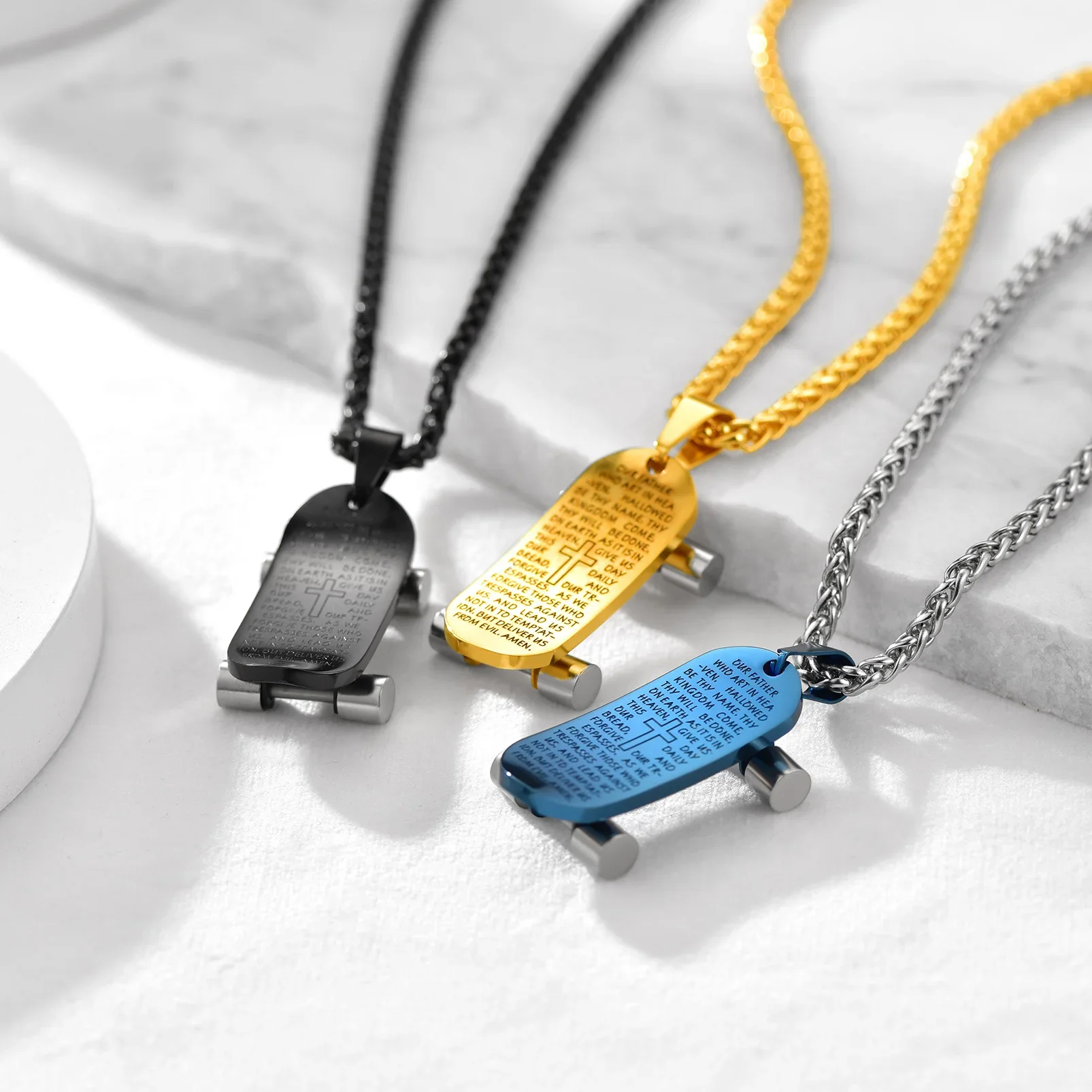 A cool skateboard biker pendant necklace: Inspiring Bible verses are engraved on the skateboard. You will be the focus when you are using it! The Christian catholic the lord’s prayer is a magical pattern. This unique cross scripture skateboard necklace can bring good luck to the wearer and make the wearer braver.