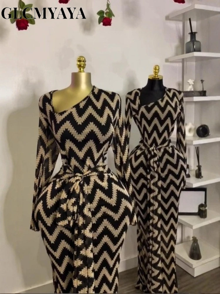 CM.YAYA Abito lungo aderente a maniche lunghe con stampa a righe da donna 2025 Autunno da sera Vacanza da notte Abiti da festa Abiti sexy