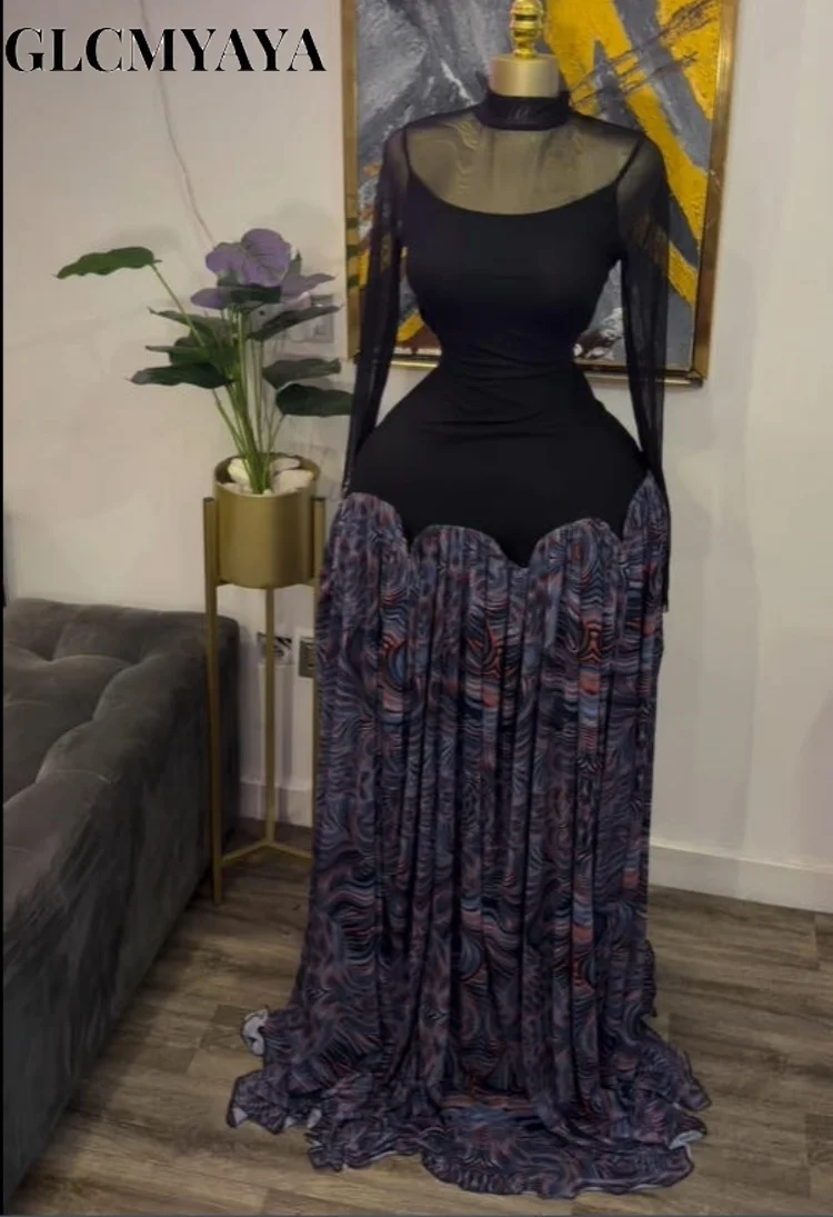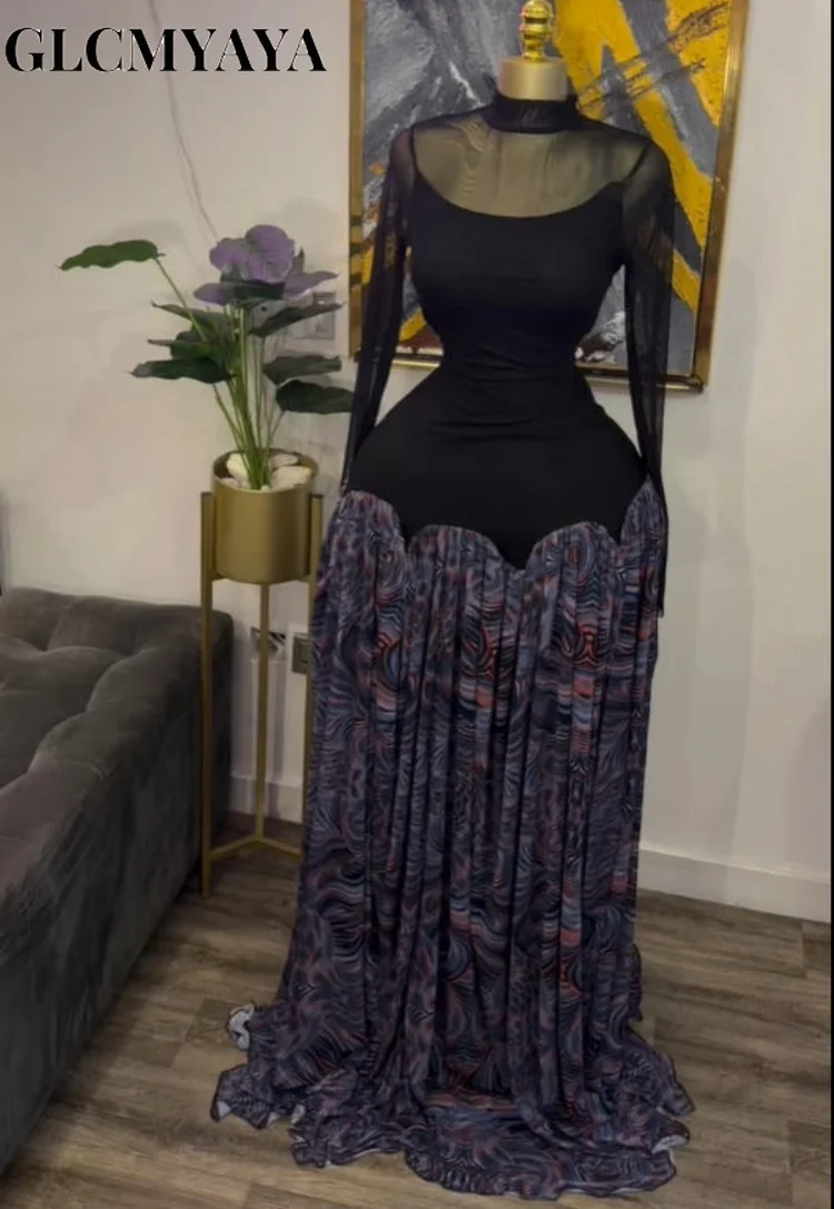 Abiti da donna a maniche lunghe autunnali con avvolgenti sui fianchi Abito da festa vuoto patchwork in pizzo nero Abito attillato a vita alta con scollo a barchetta