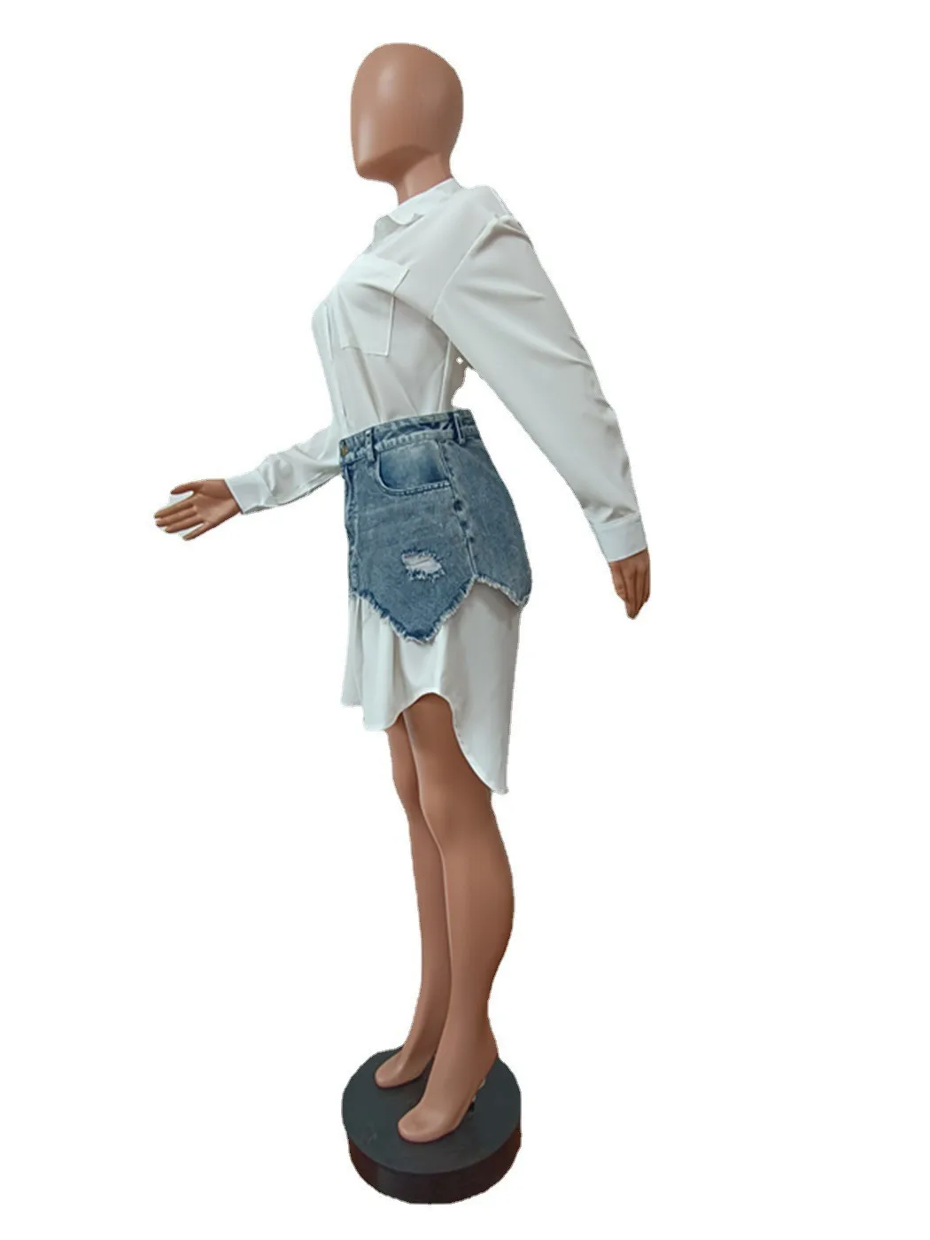 CM.YAYA Vintage donna manica lunga colletto rovesciato camicia stile camicetta vestito con Denim Jean minigonna irregolare due 2 pezzi Set