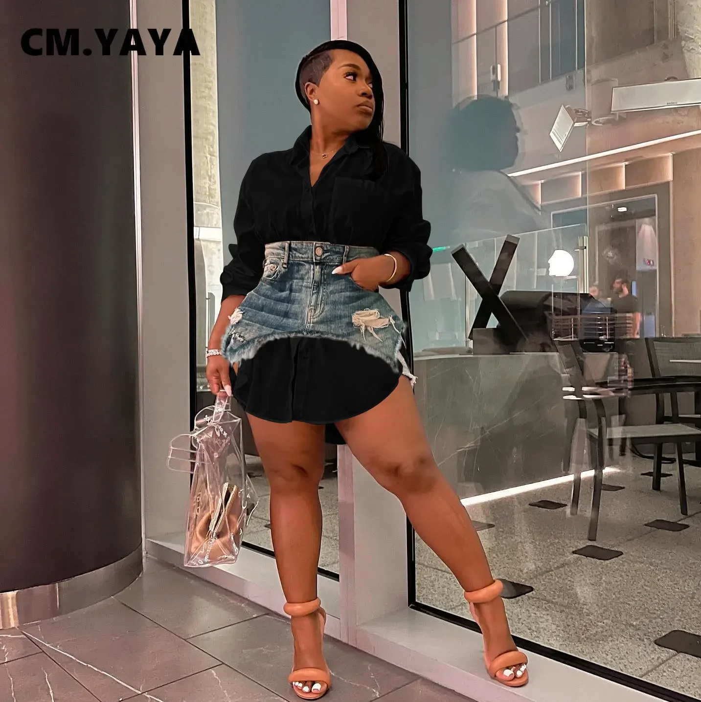 CM.YAYA Vintage donna manica lunga colletto rovesciato camicia stile camicetta vestito con Denim Jean minigonna irregolare due 2 pezzi Set