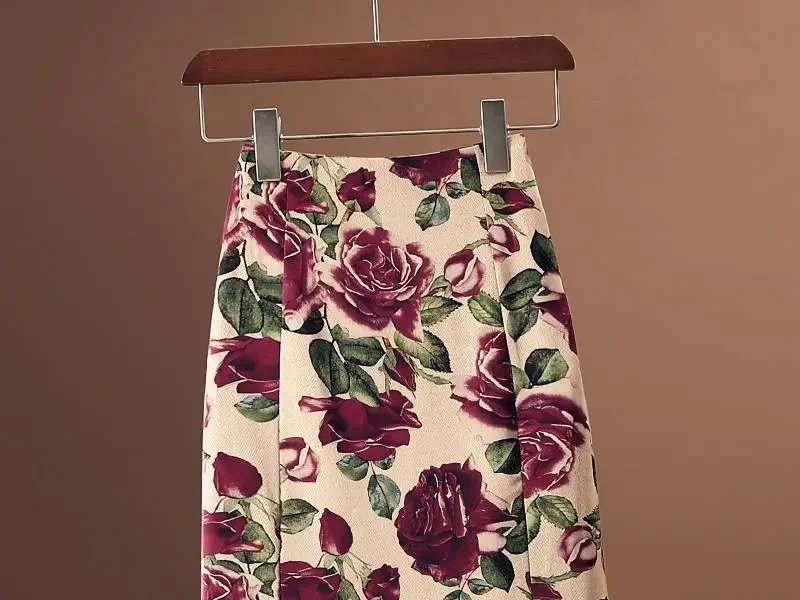 Coda di pesce Rosa Stampa floreale Elegante A-line a vita alta Tromba Gonna da donna Gonne lunghe a metà polpaccio per abbigliamento donna Moda