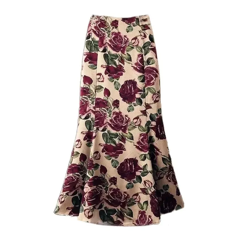Coda di pesce Rosa Stampa floreale Elegante A-line a vita alta Tromba Gonna da donna Gonne lunghe a metà polpaccio per abbigliamento donna Moda