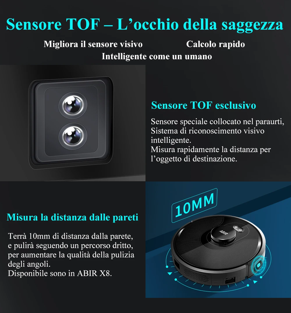 3. X8 ha speciale TOF saggezza sensore. Pulito da due occhi, per promettere una maggiore efficienza e una pulizia più intelligente. Diverso da altre marche!