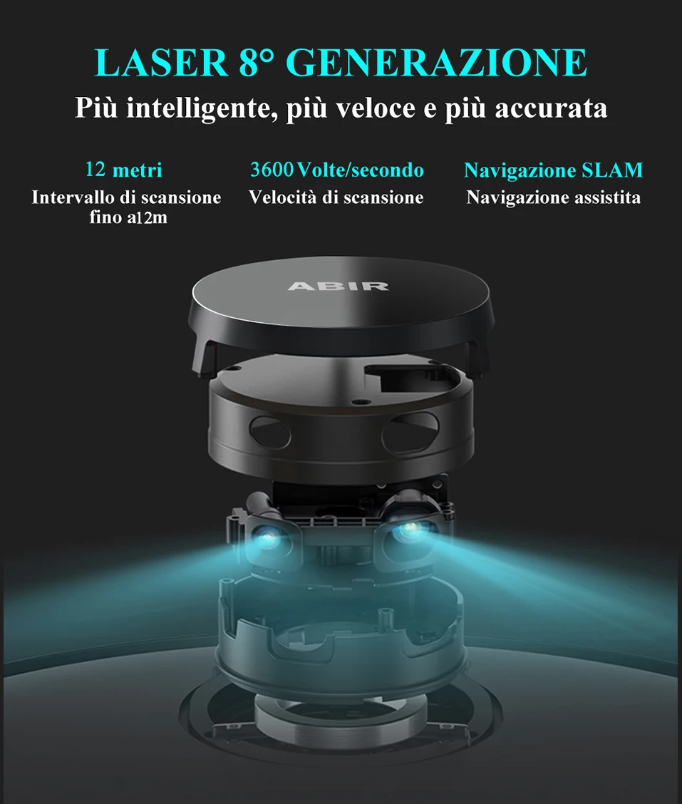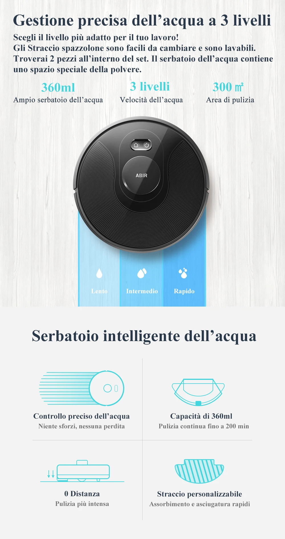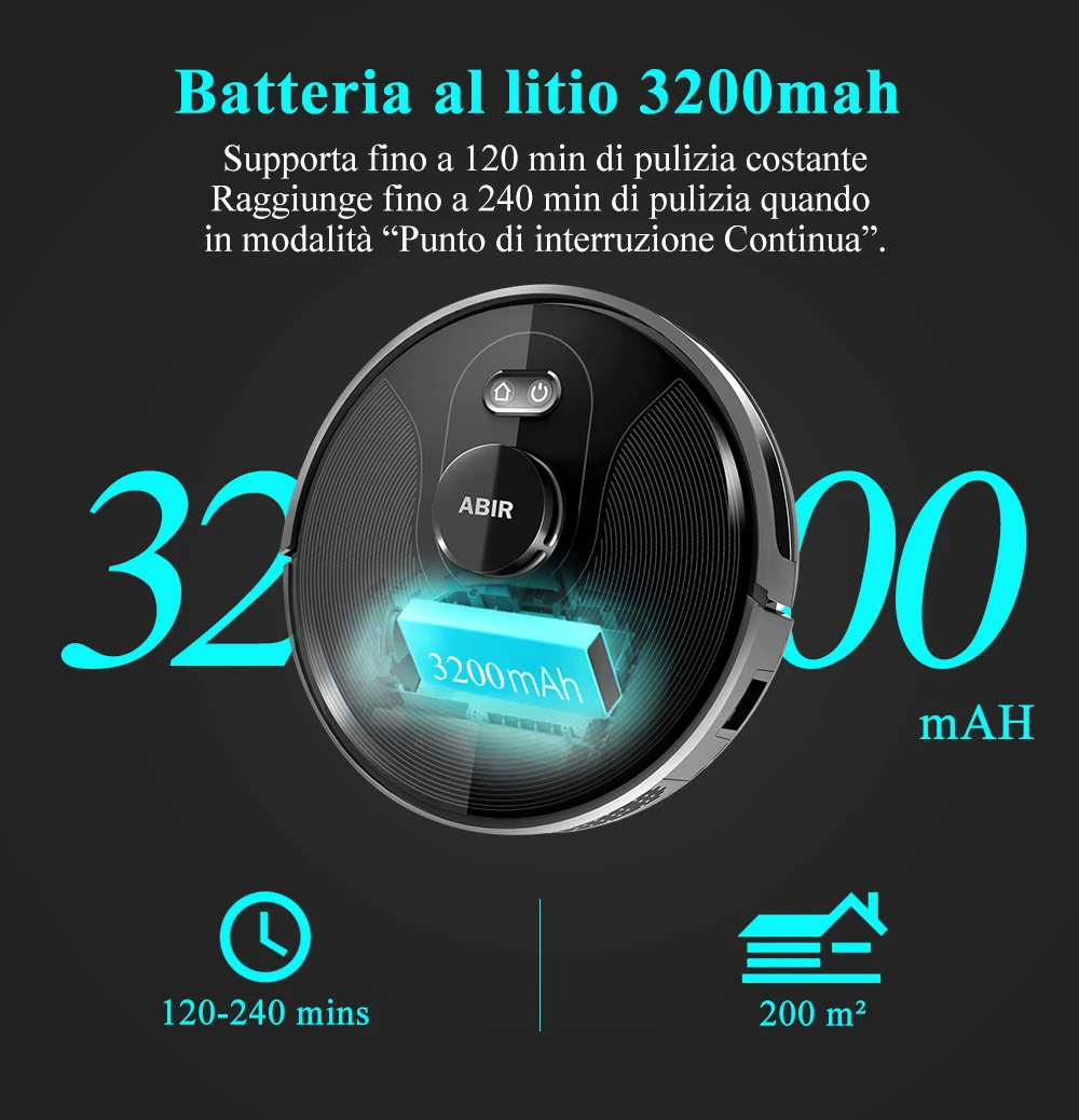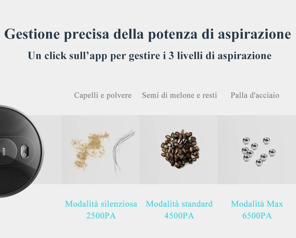 8.Aggiornato motore del ventilatore fare reale 6500 PA di aspirazione con basso rumore . Utilizzando la strategia combinata di riduzione del rumore 7 volte, ABIR X8 è molto silenzioso rispetto ad altre marche quando è in modalità max.