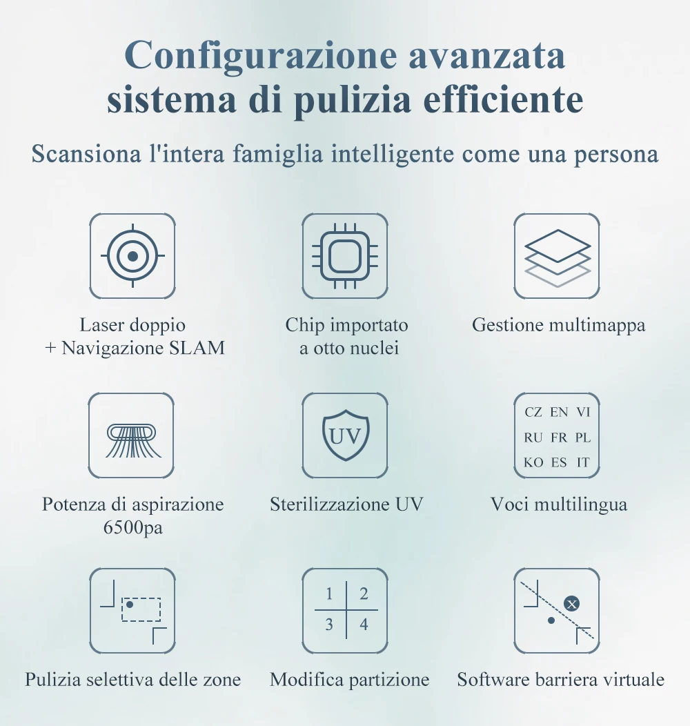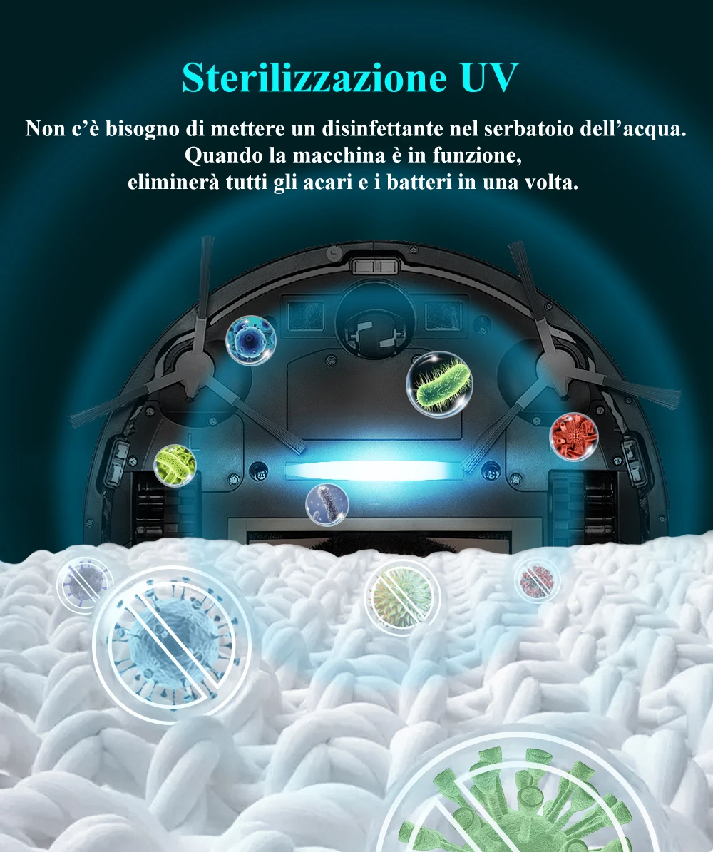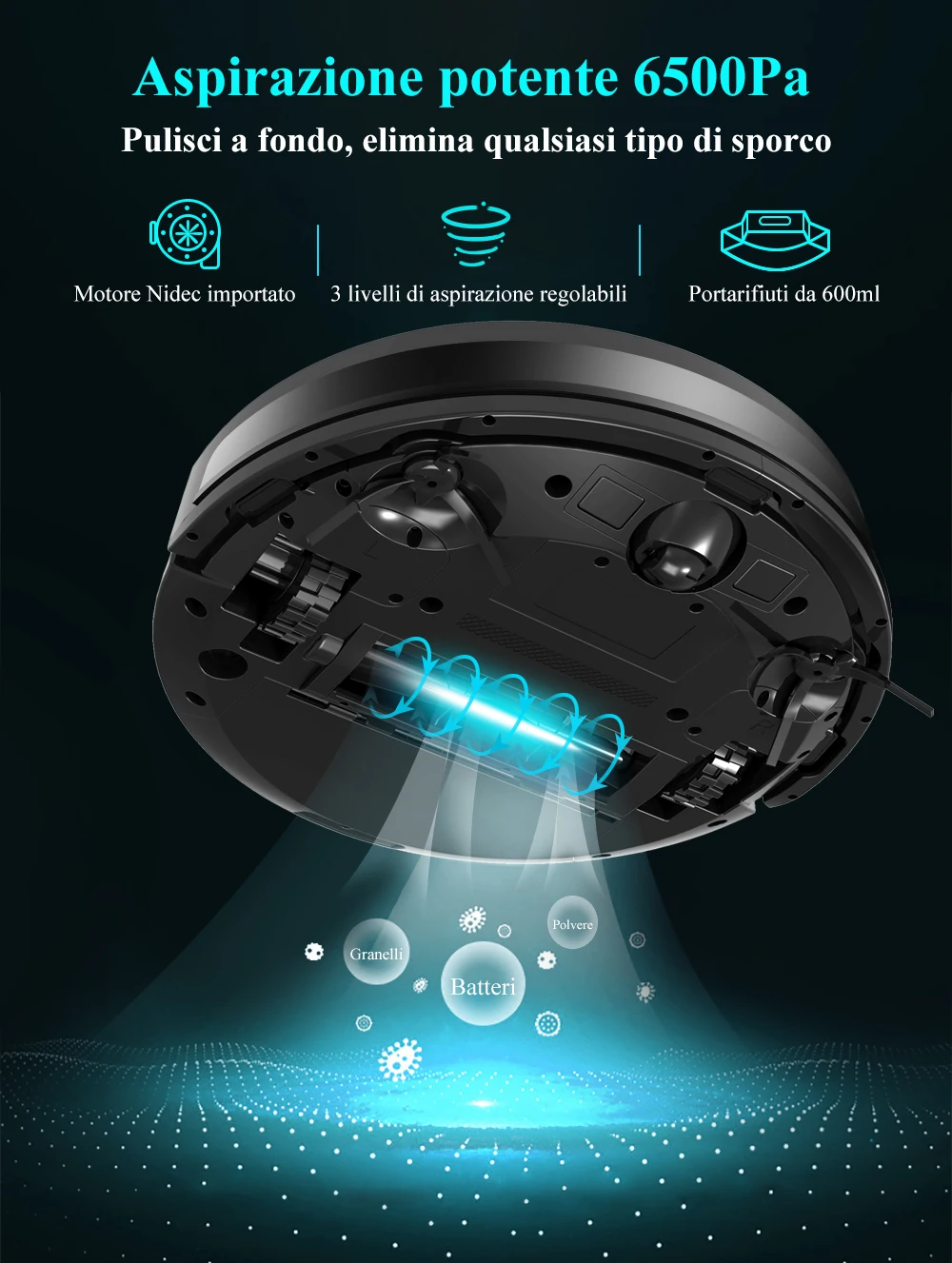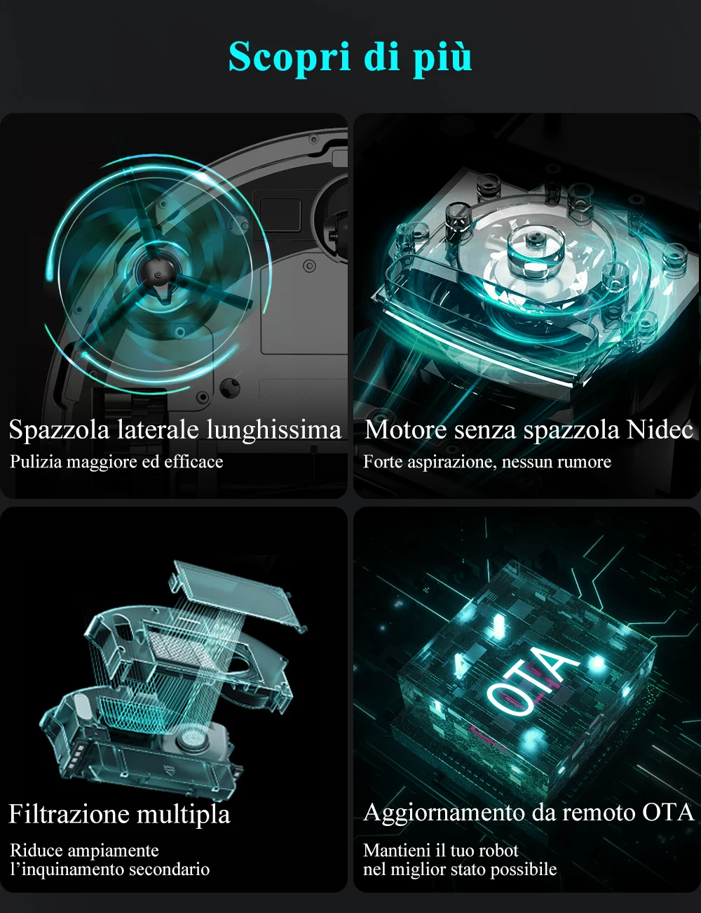 8.Aggiornato motore del ventilatore fare reale 6500 PA di aspirazione con basso rumore . Utilizzando la strategia combinata di riduzione del rumore 7 volte, ABIR X8 è molto silenzioso rispetto ad altre marche quando è in modalità max.