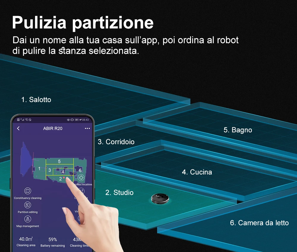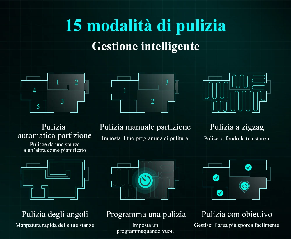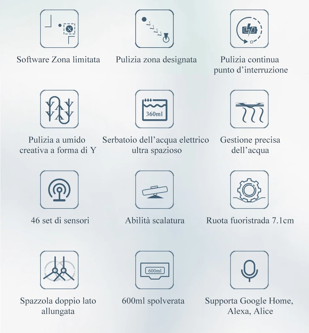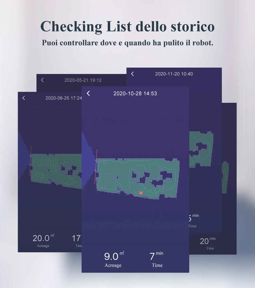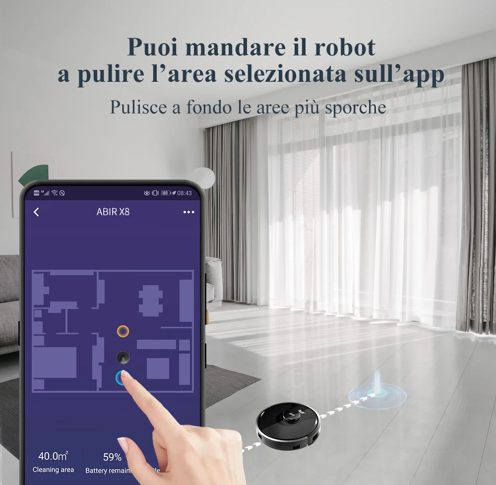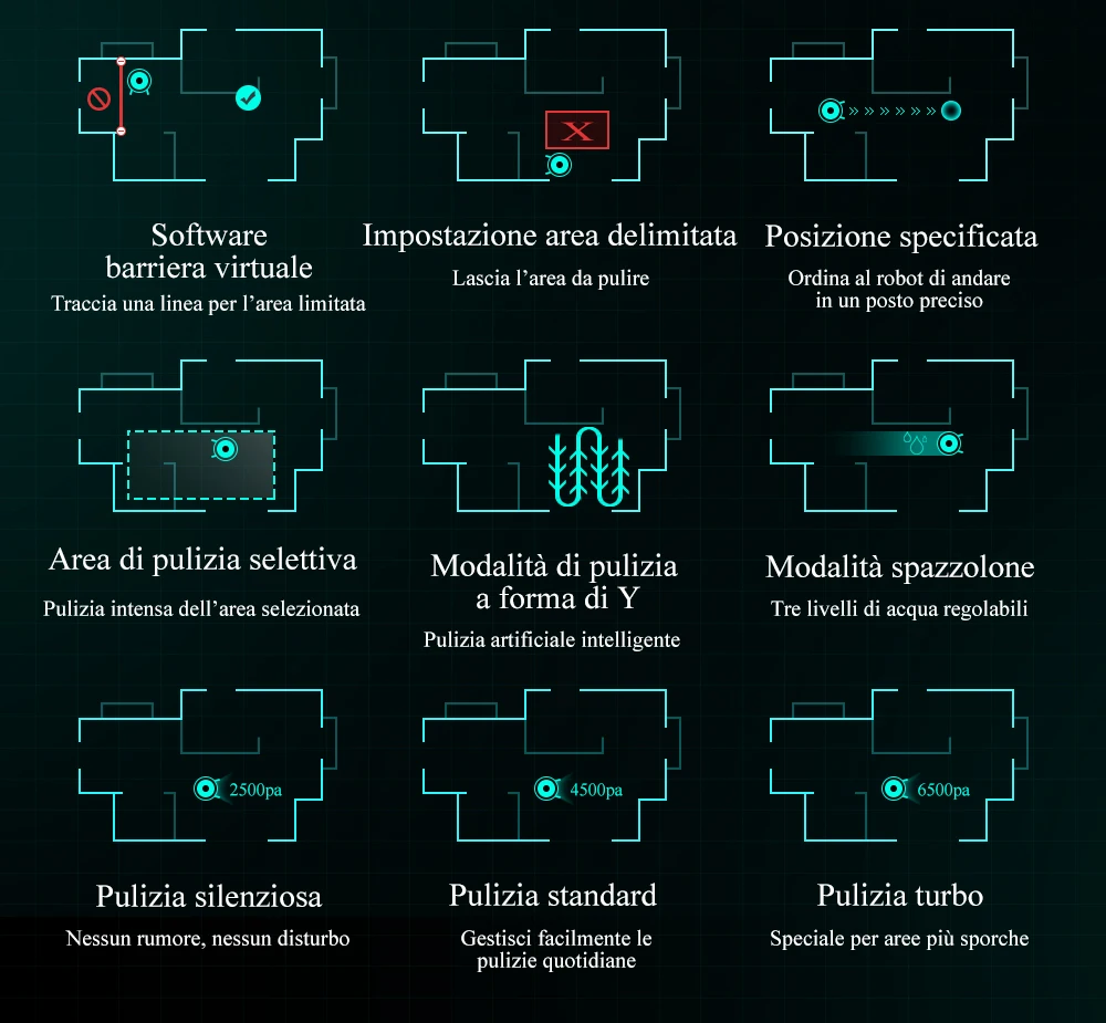 5. X8 ha aggiunto funzioni extra su app, È possibile impostare il numero di volte per pulire una certa area.È possibile impostare la sequenza di pulizia di stanze diverse. Volume e aspirazione dell’acqua della stanza personalizzati, è possibile scegliere la migliore quantità di acqua e l’aspirazione diversa per pulire diversi tipi di pavimento .