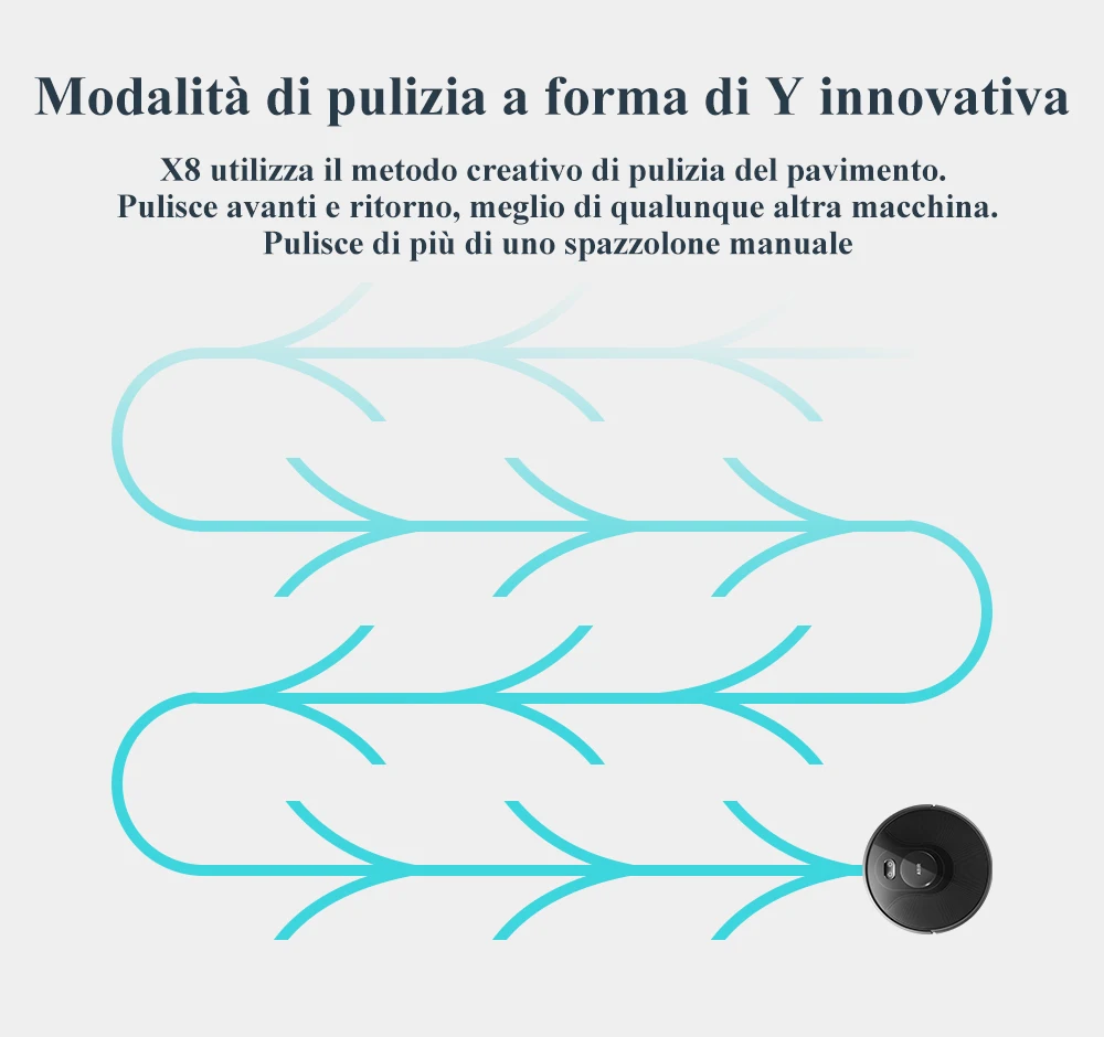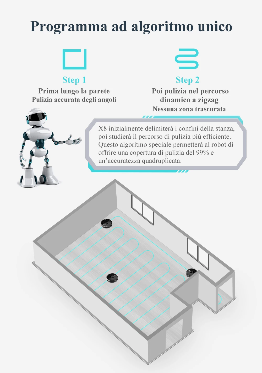 4. Programma speciale Algoritmo solo per X8, Prima determinare il confine della stanza, quindi capire il percorso di pulizia più efficiente.L’altra marca funziona solo nel percorso normale AI. Bassa copertura rispetto a X8.