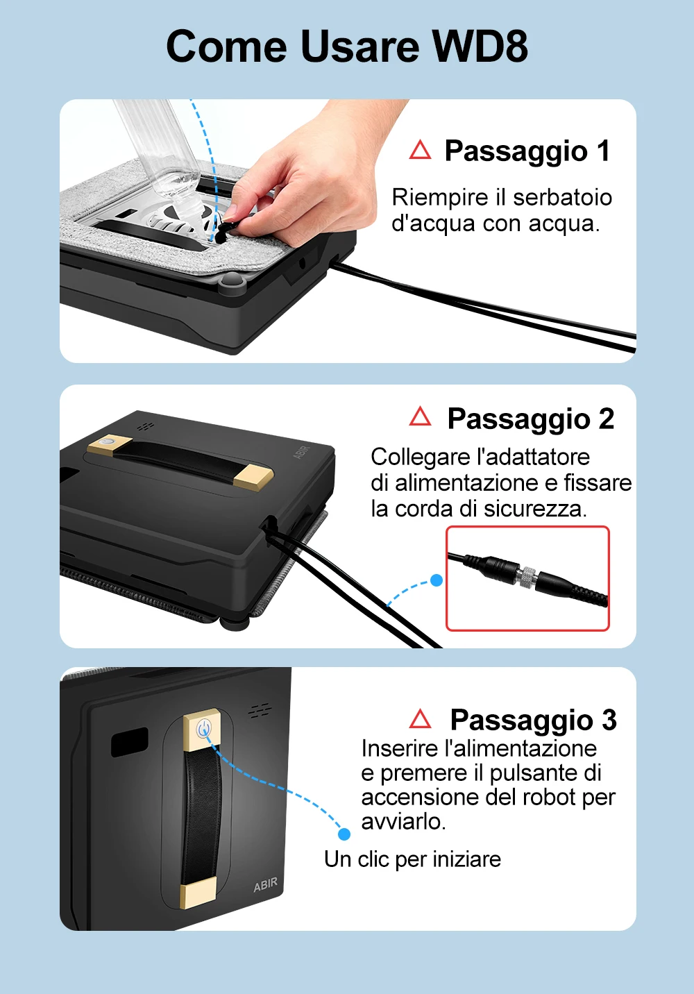 11.Sistema di memoria intelligente: ABIR WD8 è dotato di un sistema di memoria intelligente. Al termine della pulizia, ritorna nella sua posizione originale. In questo modo è facile rimuovere il robot dall’esterno della finestra dopo il lavaggio.