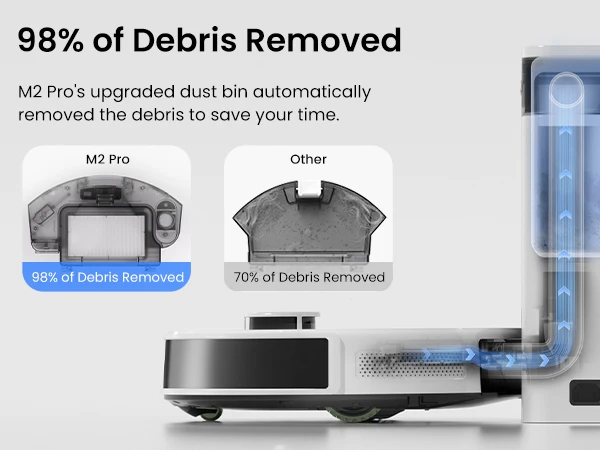 Il contenitore per la polvere aggiornato di M2 Pro rimuove automaticamente i detriti per risparmiare il tempo.