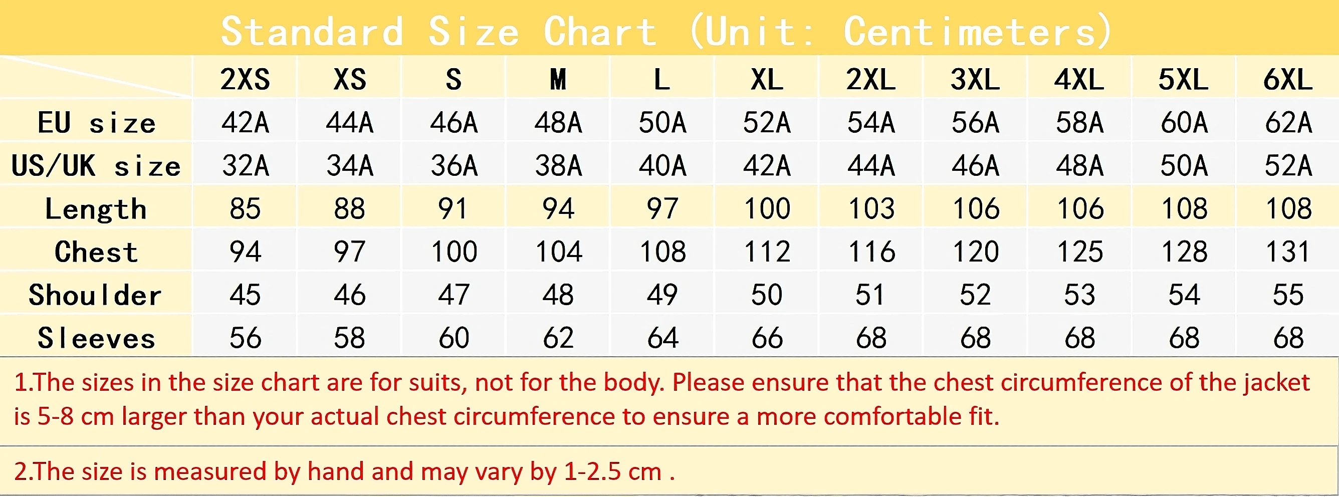 2.Selezione delle dimensioni: scegliere la taglia più stretta basata sulle misurazioni del torace e della vita e si riferisce alla tabella delle taglie. Si prega di garantire la circonferenza torace del blazer è di 2-3 cm più grande della circonferenza torace reale, quindi che puoi indossarlo più comodamente. Se sei unsure, per favore conosciamo le misure di altezza, peso, petto e vita e siamo raccontiamo la taglia più adatta per te.