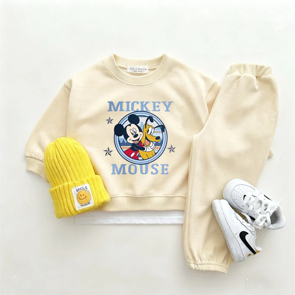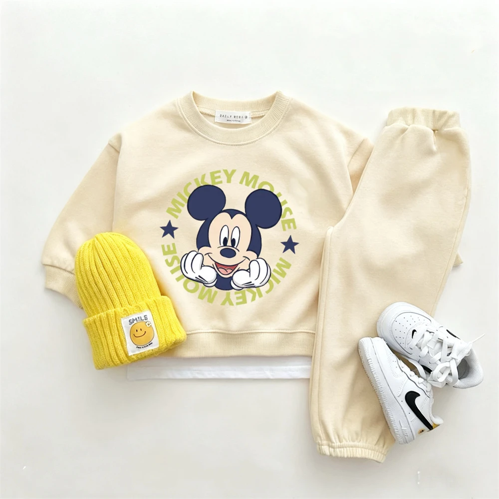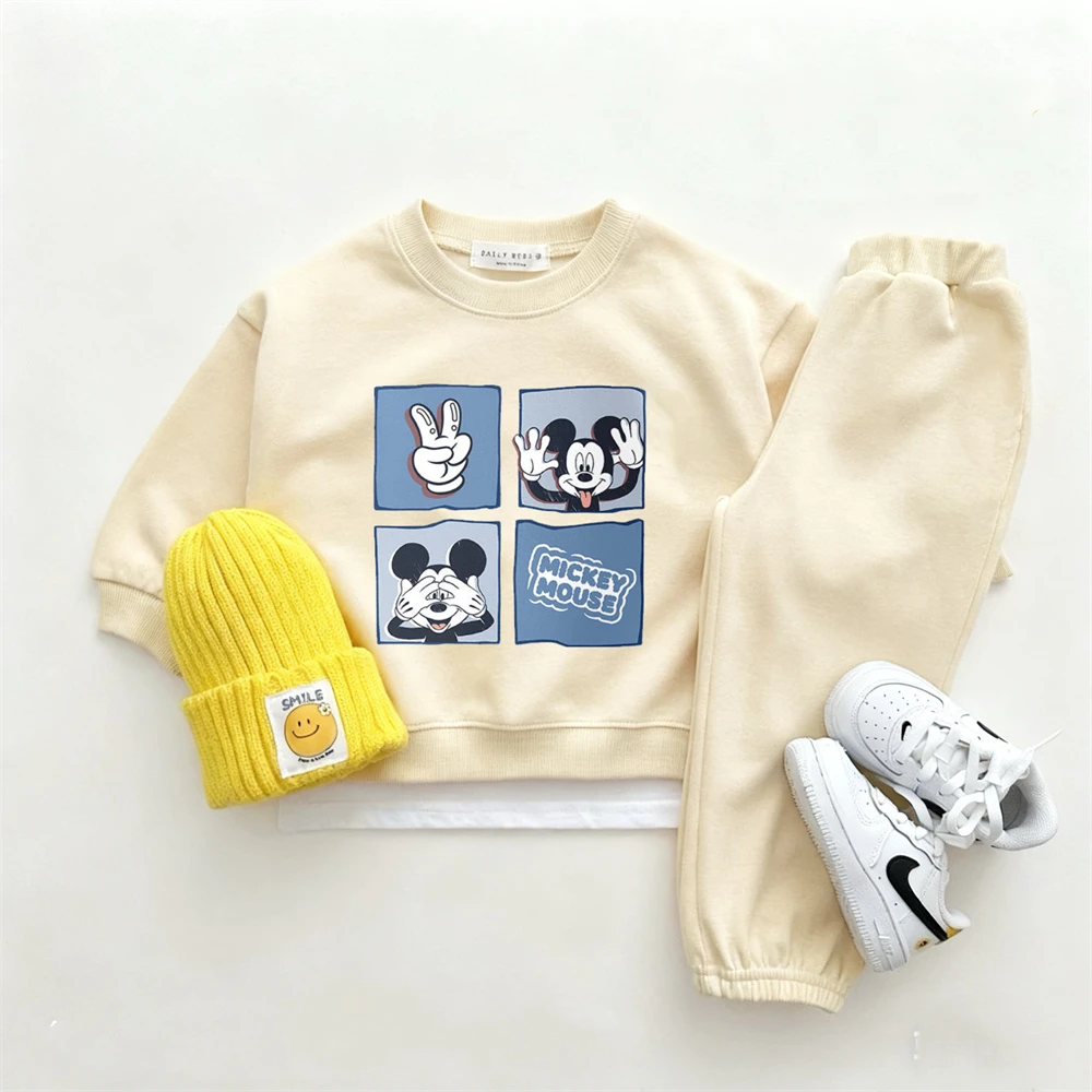 Completi a maniche lunghe Disney Nuovi abiti per bambini Top stampati a fumetti Felpa con cappuccio girocollo Tinta unita Due pezzi Abbigliamento primavera/autunno per ragazzi