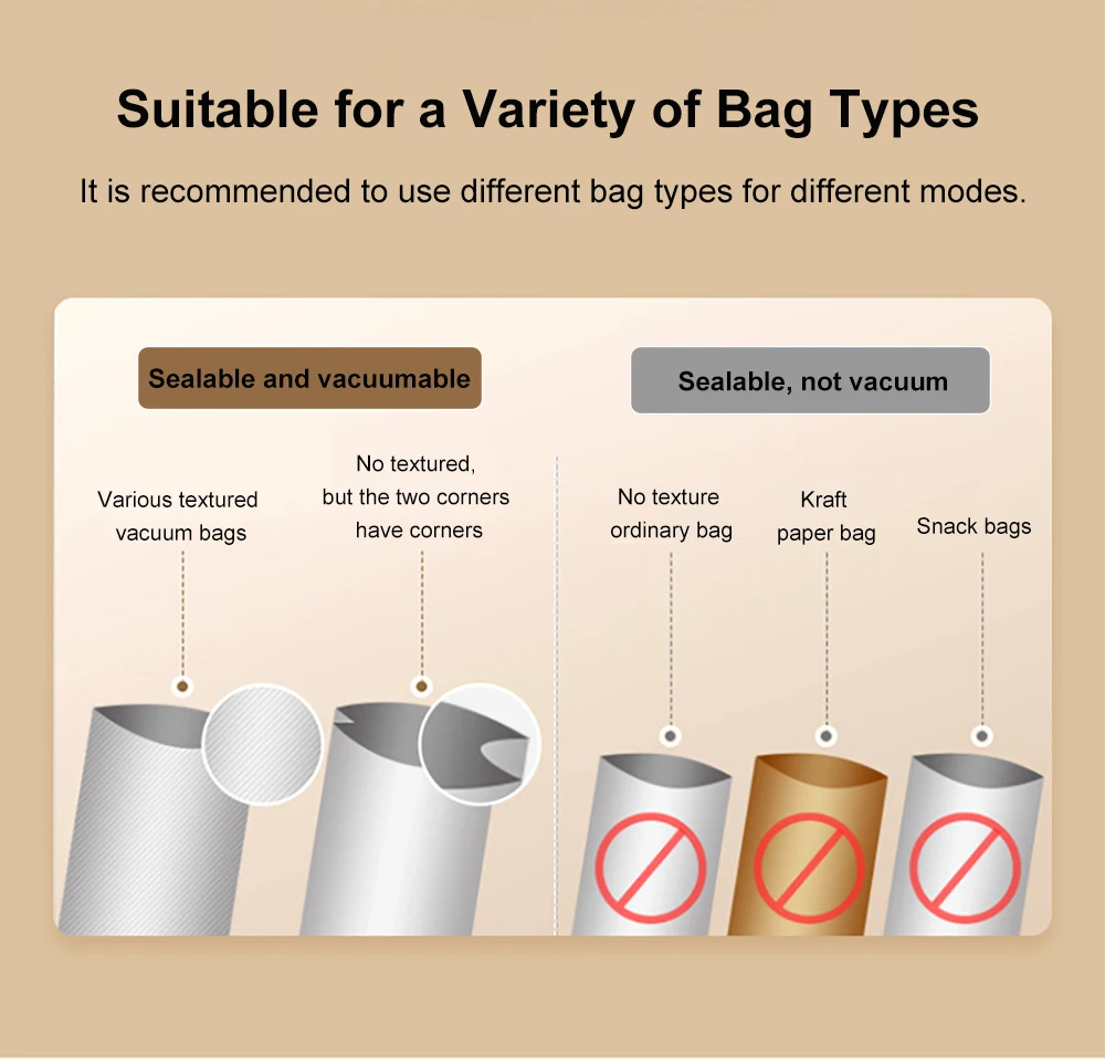 Modalità versatili 2 in 1: che si tratti di sigillare snack secchi, cibi umidi o oggetti delicati, la nostra macchina supporta la sigillatura asciutta, umida e delicata.Conserva facilmente di tutto, da carne e frutti di mare a frutta, noci e persino piatti marinati.