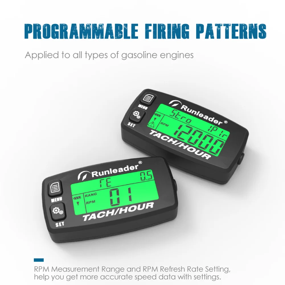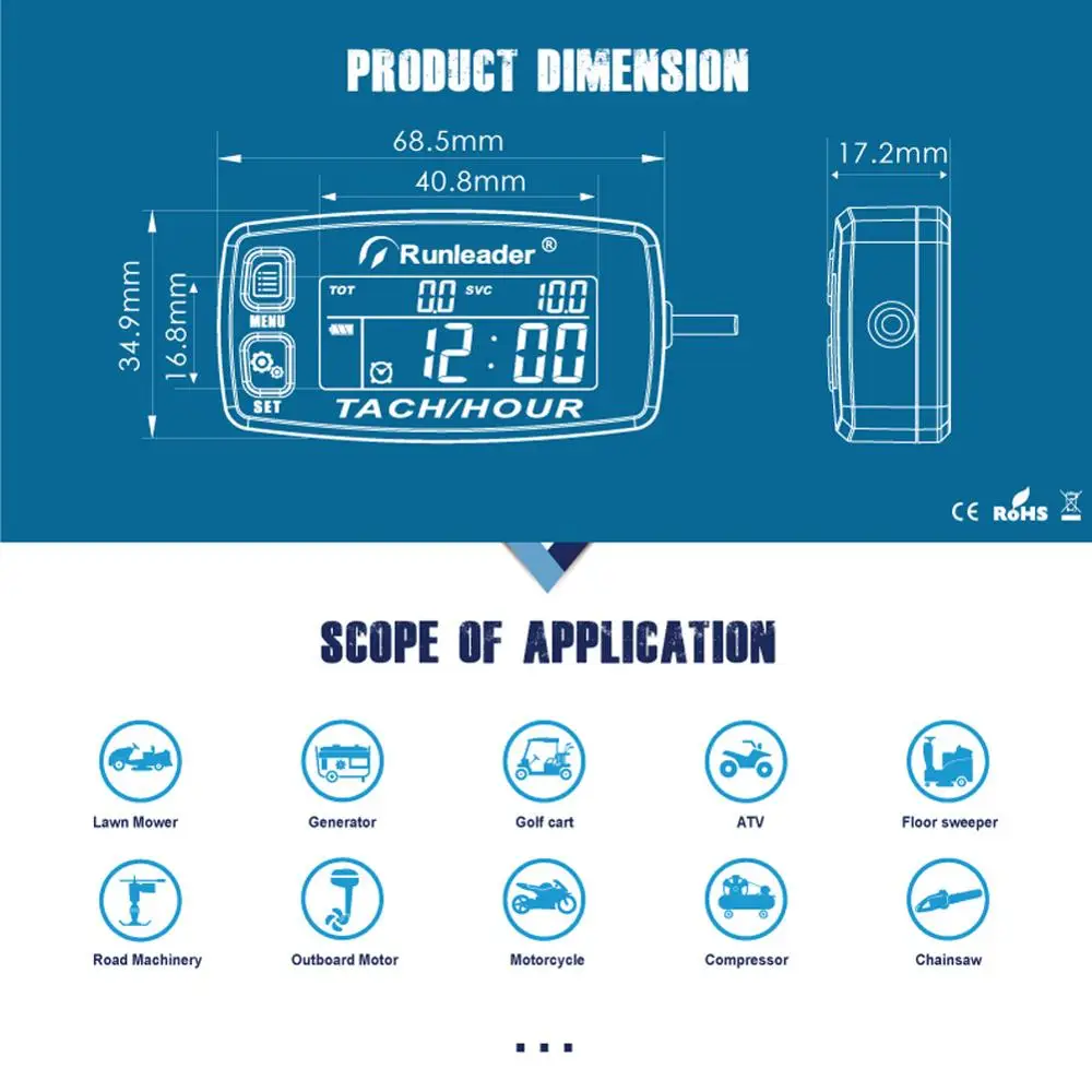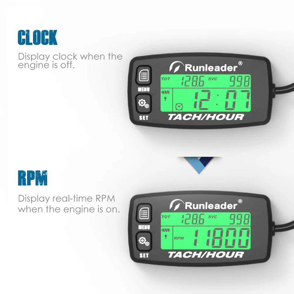 Il contagiri per promemoria di manutenzione digitale del motore autoalimentato RL-HM032B contiene contagiri, contaore, timer di servizio, timer di lavoro, promemoria programmabile max RPM e selezione modalità retroilluminata. Batteria sostituibile, funzione di spegnimento e design impermeabile.