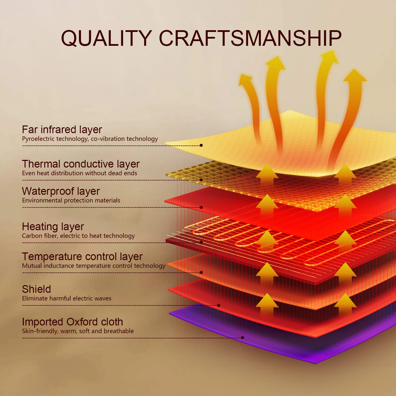 5.Design di sicurezza: il filo riscaldante della coperta da sauna a infrarossi non è facile da piegare.Quando la temperatura raggiunge 75°C, il soffitto scollegra automaticamente la linea, ferma il riscaldamento e gli allarmi.Si aggiunge anche la conduzione del calore a infrarossi lontani e la protezione contro l’anomalie termiche.Evitare le ustioni causate dall’uso migliorante.