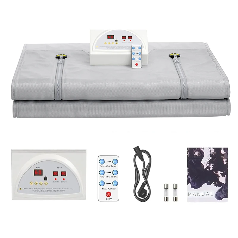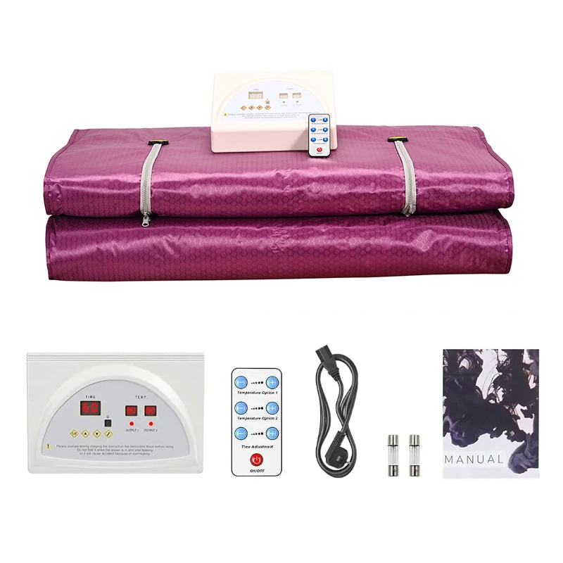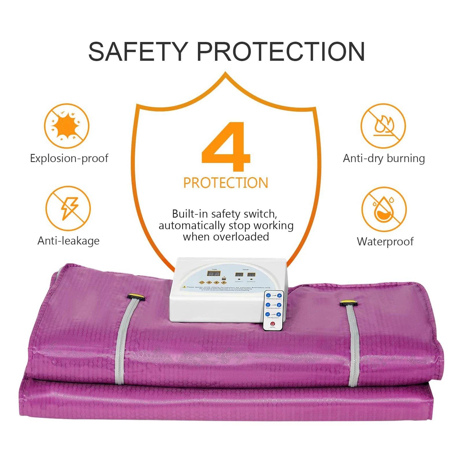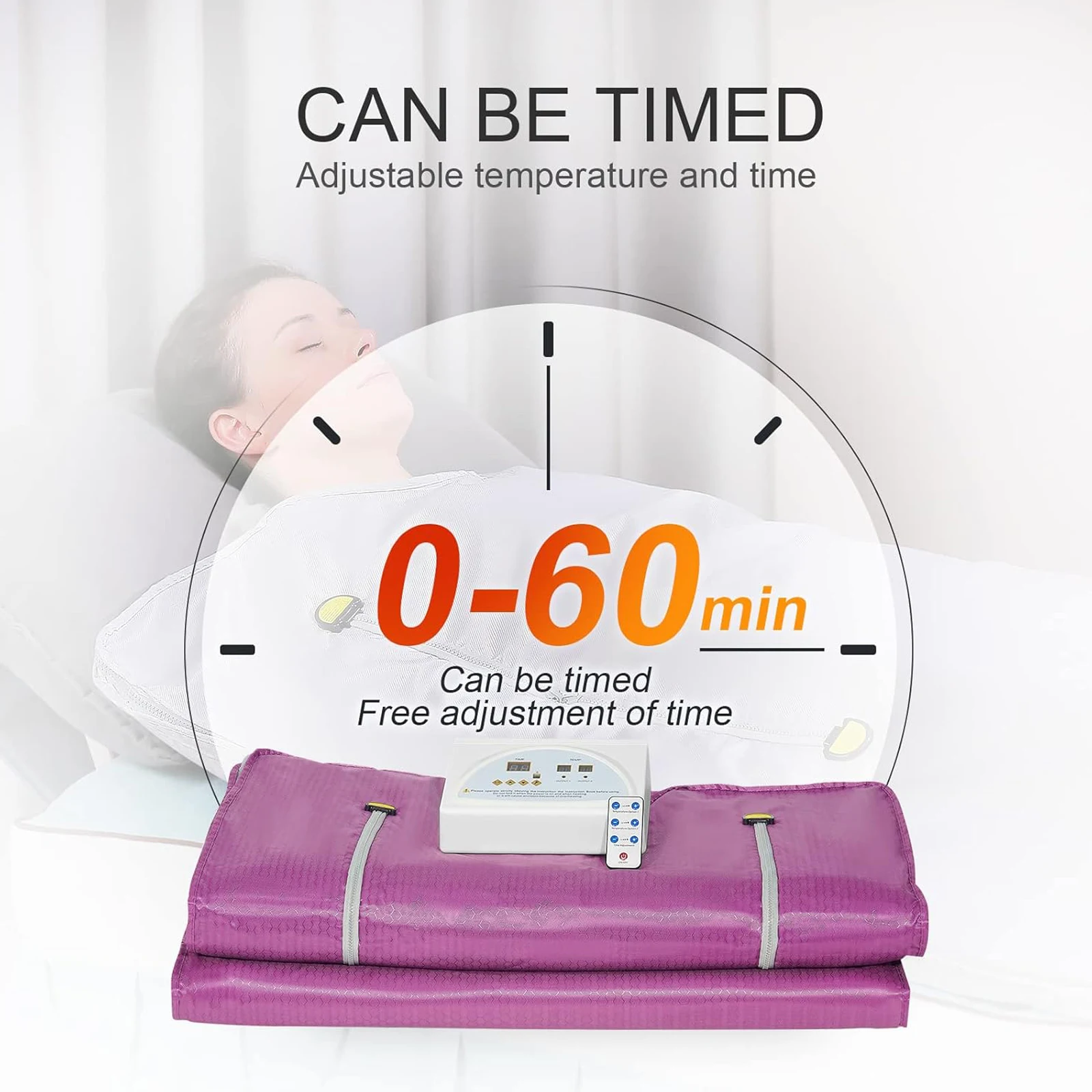 4. Utilizzare: attraverso il controller per regolare la temperatura da 35-70 Celsius, il tempo può essere impostato da 15-60 min. La coperta sottile a due zone rende la parte anteriore e posteriore del corpo per perdere peso e disintossicare. La batteria non è inclusa nel telecomando.