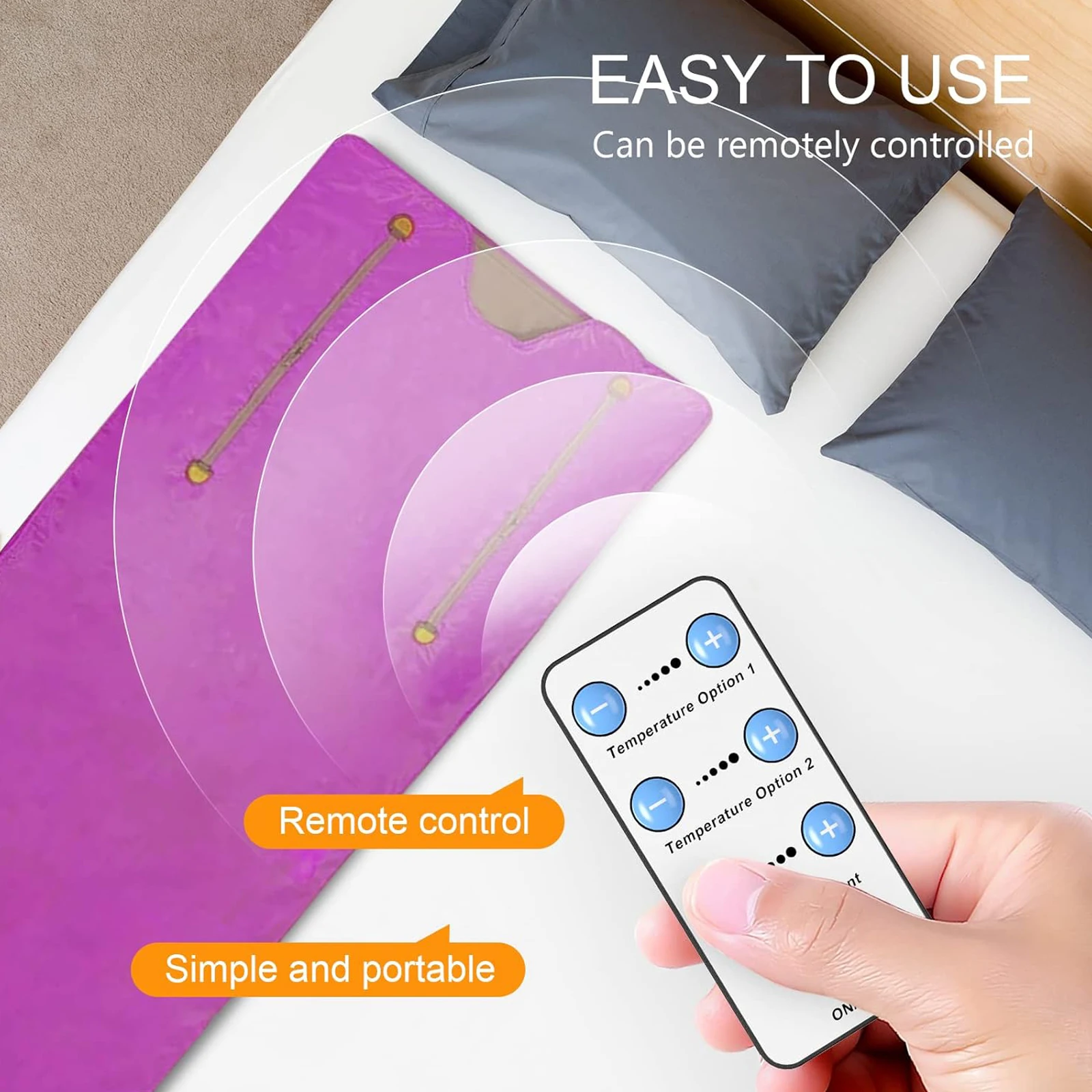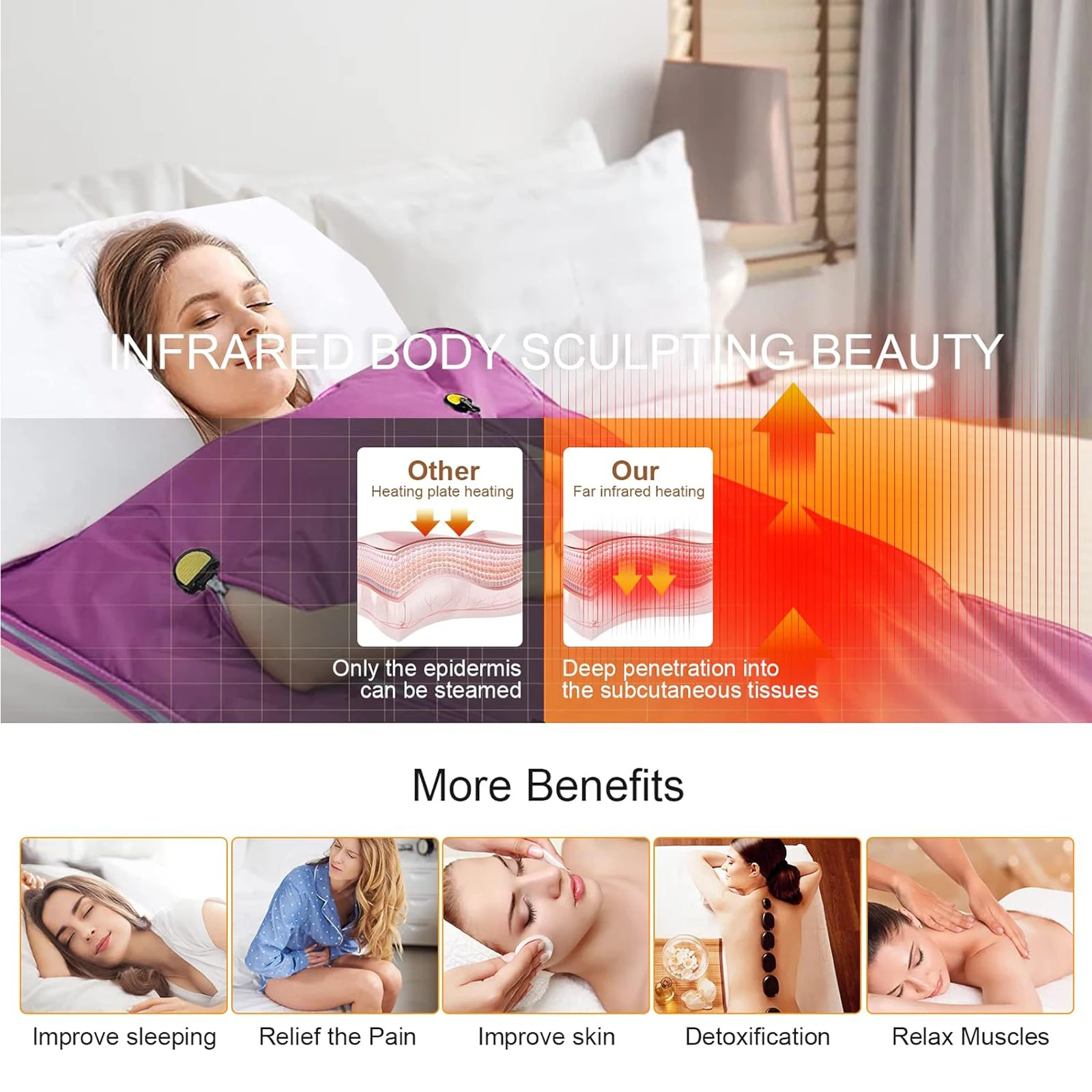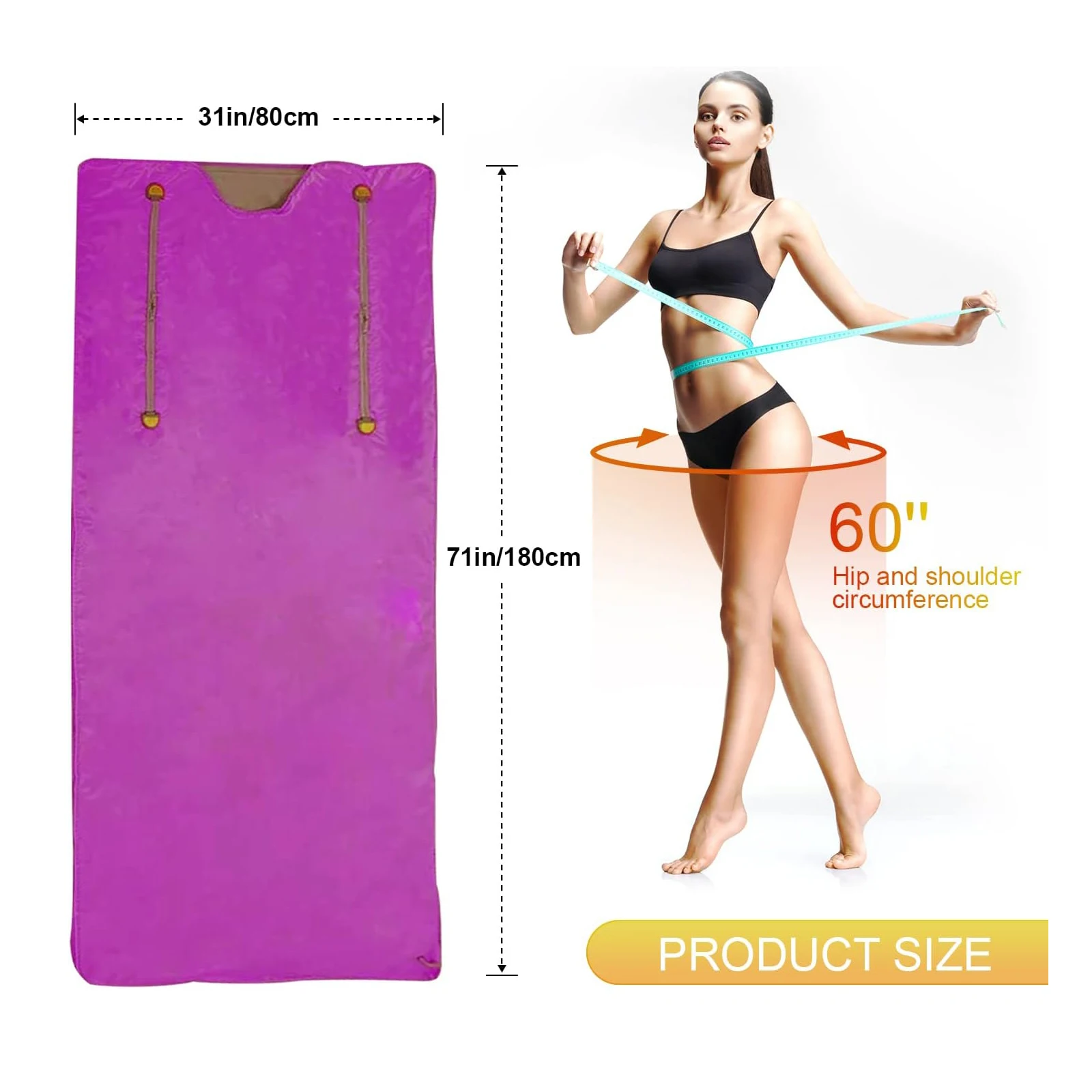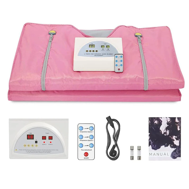 4. Utilizzare: attraverso il controller per regolare la temperatura da 35-70 Celsius, il tempo può essere impostato da 15-60 min. La coperta sottile a due zone rende la parte anteriore e posteriore del corpo per perdere peso e disintossicare. La batteria non è inclusa nel telecomando.