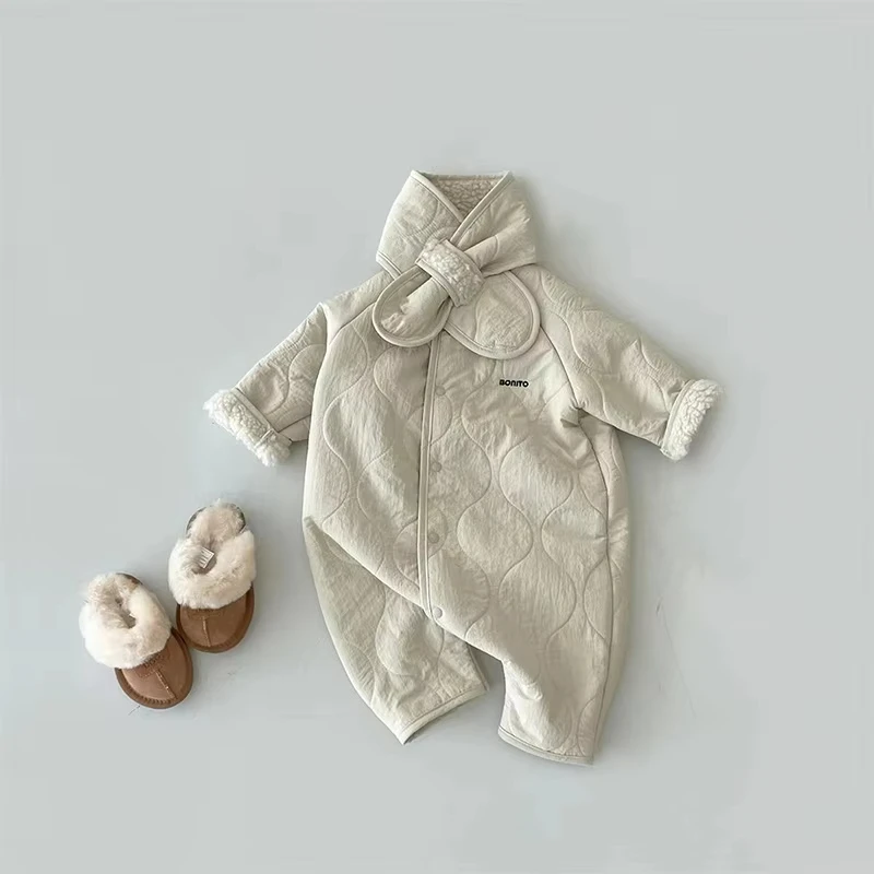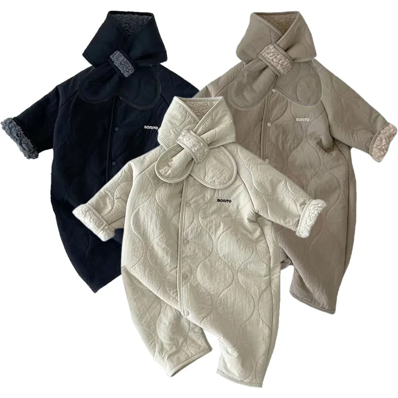 Coreano Baby Tuta Sciarpa Set Autunno Inverno Pagliaccetto di lana di agnello per le ragazze dei ragazzi Vestiti infantili del bambino Allentato Tutina neonato 2 pezzi