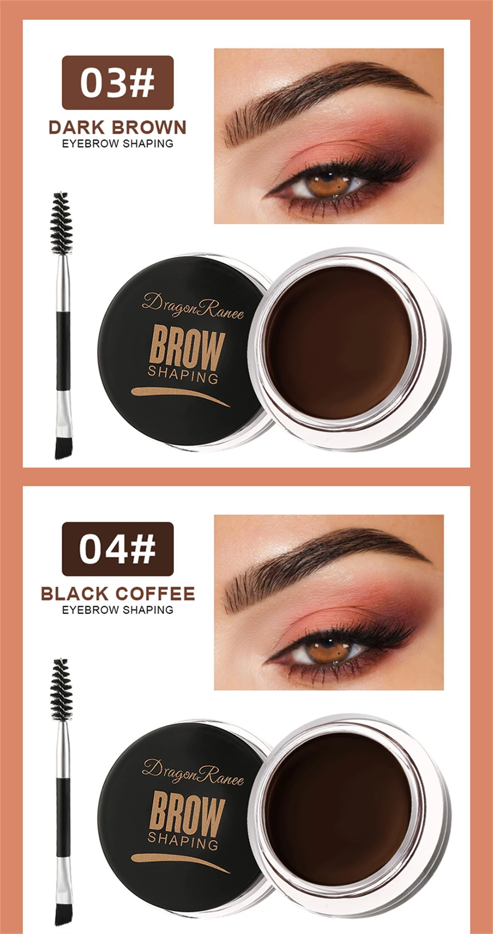 Usage: Use eyebrow brush, vegetables take appropriate amount of paste, from the brow to the end of the natural transition. If you need to strengthen the effect can be repeated superposition.