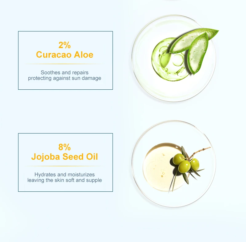 Infusé d’une forte concentration d’huile de graines de jojoba naturelle et de vitamine E, il est leger, agreable pour la peau et hydrate délicstatement sans sensation de gras, offrant une experience de protection solaire sans loudeur sur la peau.