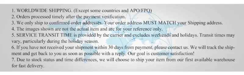 3.Se l’indirizzo è un’area remota, ti contattare, devi aggiungere 35 USD Spese di spedizione extra, ma se non rispedici nel tempo e paghi, scegliamo l’antenere metodo di spedizione per te.