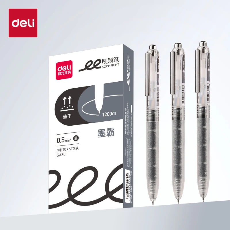 Name: Deli gel penModel: SA30-1Specification: 0.5mmPeculiarity: 1. Precision-machined 0.5mm ST nib, a new generation of quick-drying ink, clear handwriting, not easy to bleed, strong water resistance, no smudging after dripping, wear-resistant and durable, reliable quality, stable ink, suitable for a variety of writing angles.2. Large capacity gel pen, can write 1200 meters.3. Pen clip design, easy to carry, prevent loss, prevent rolling off. 4. Soft rubber sheath, comfortable to hold the pen, smooth writing.
