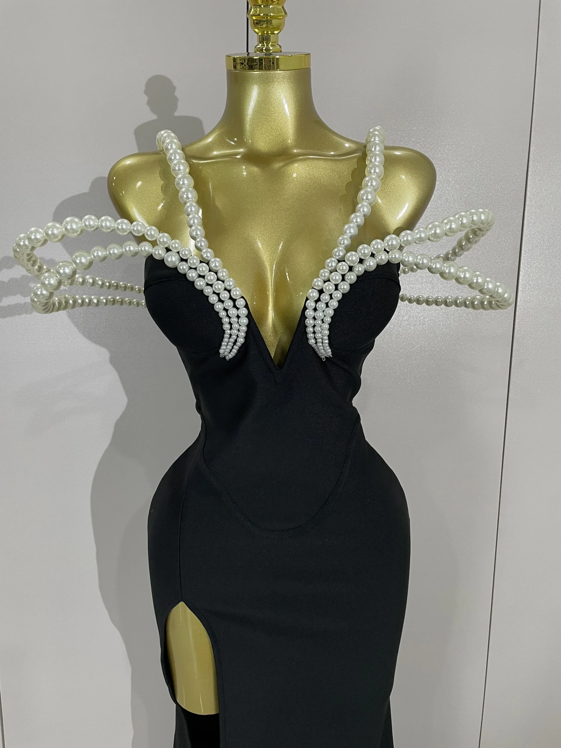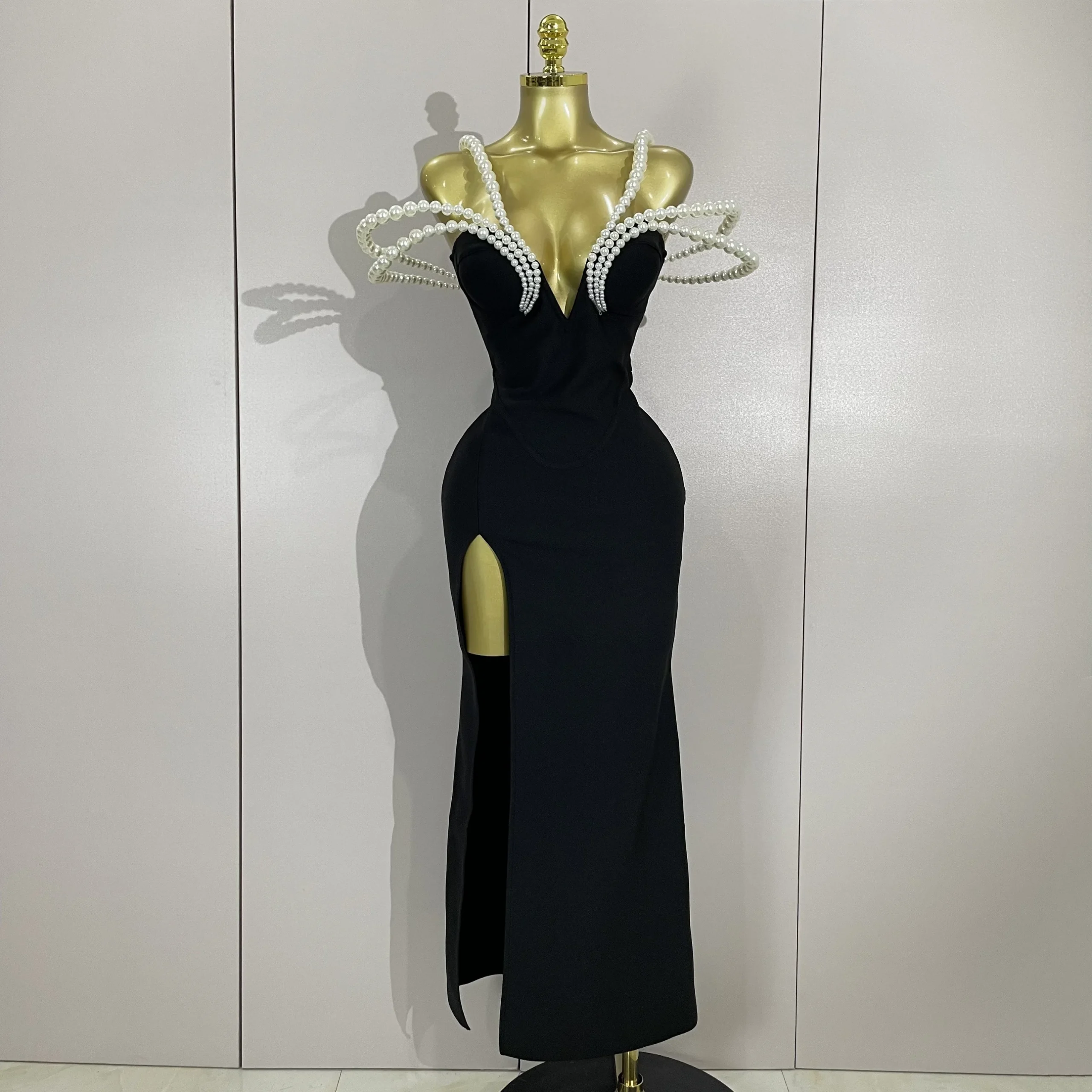 Designer di lusso Perle Scollo a V Maxi Fasciatura lunga Abito aderente Donna Celebrity Evening Party Abiti di compleanno Costumi di scena per cantanti