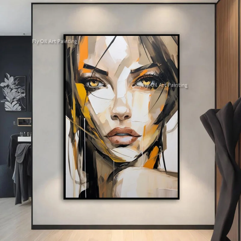 Dipinto a mano marrone e beige viso di donne pittura a olio astratta grande faccia di donna arancione tela arte della parete arte moderna per la decorazione domestica