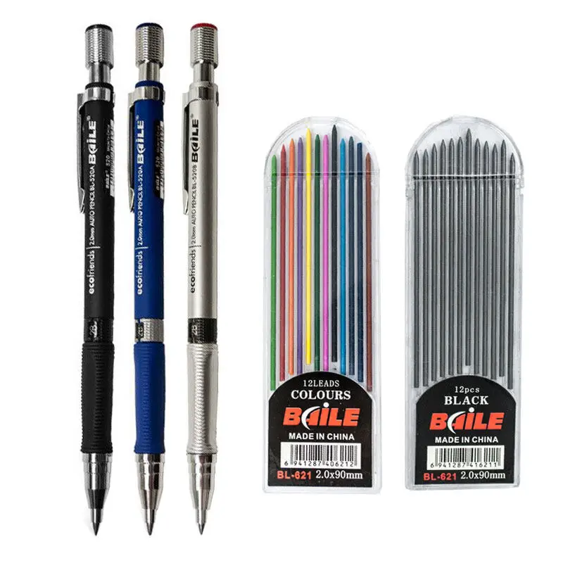 Descrizione del prodotto:Peso: 10 gDimensioni del nucleo di piombo: 2,0 mmLunghezza nucleo piombo: 9 mm, 10 mm, 12 mmTipo: matite meccanicheMateriale del corpo: metalloDurezza del piombo: 2Bcolore: nero, blu, argentoMateriale: plastica di alta qualitàmateriale della calotta: plastica