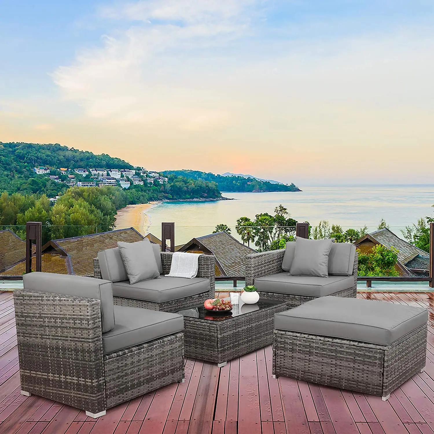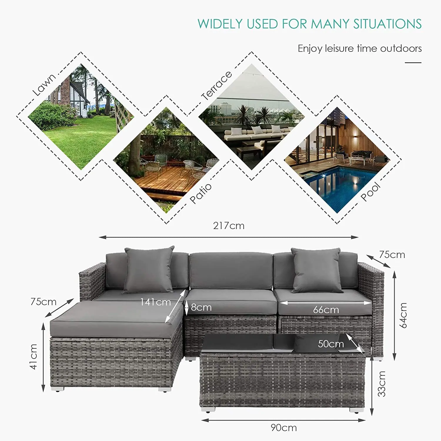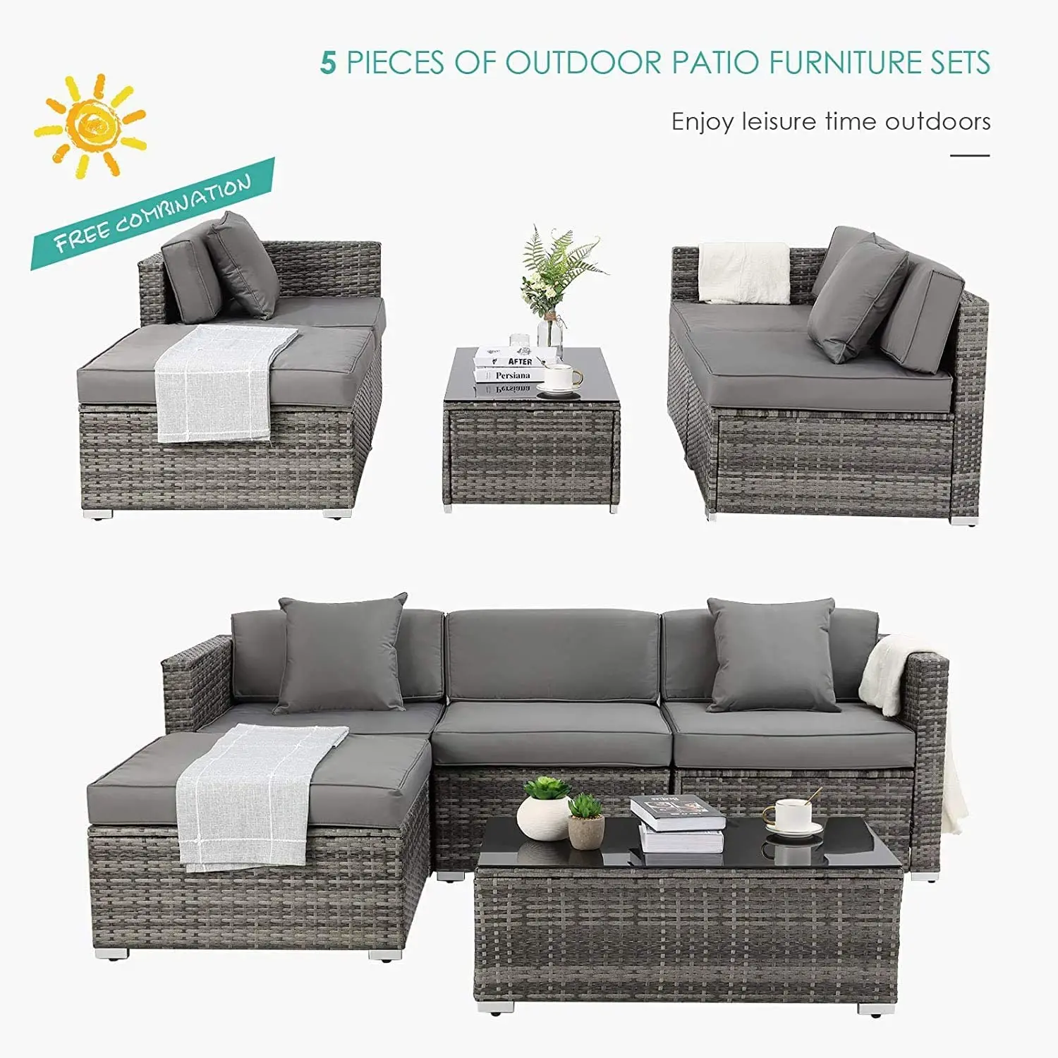 Divano lounge in polyrattan per 4-5 persone 5 pezzi Mobili da esterno Set divano ad angolo da giardino in rattan Tavolino da patio Cuscini Cuscini Nero,Grigio
