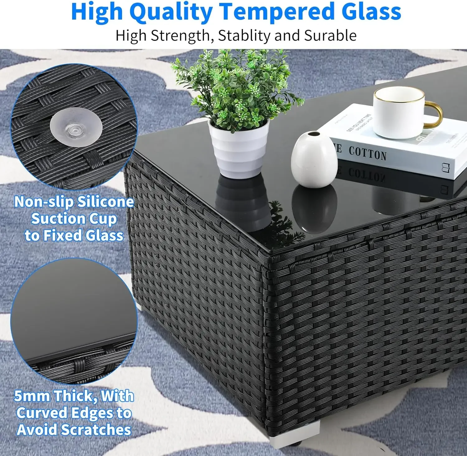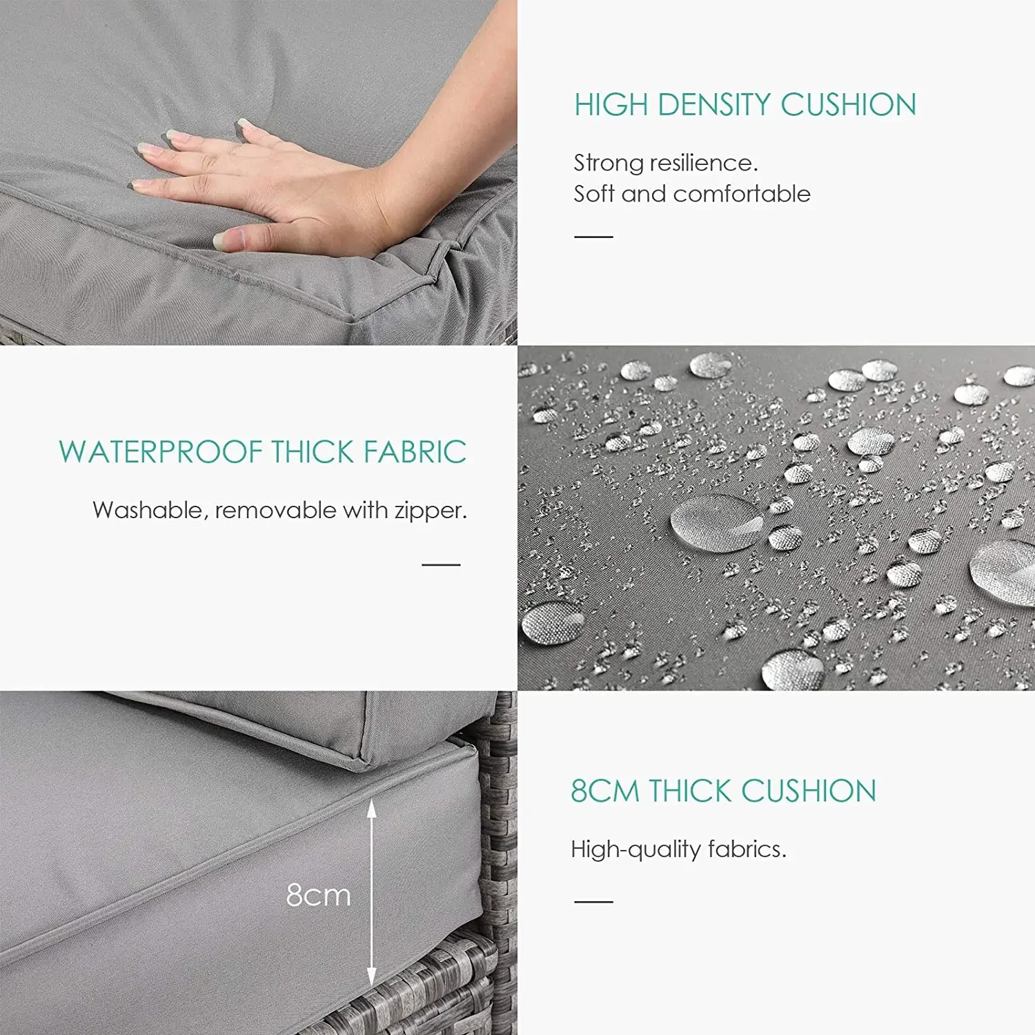 ALTA QUALITÀ E FACILE CARE: cuscini di seduta spessi 8,5 cm e morbidi cuscini per il massimo comfort.I cuscini e i cuscini del salotto da giardino sono realizzati in fibra di poliestere, la superficie è impermeabile e la cerniera è rimovibile per un facile lavaggio.Il tavolino realizzato in vetro spessore 5 mm di dimensioni 69 x 69 x 33 cm offre uno spazio sufficiente per snack e bevande.E il piano in vetro è molto facile da pulire.