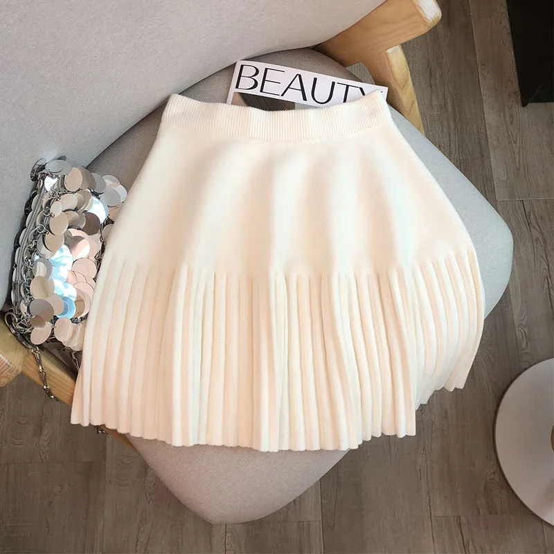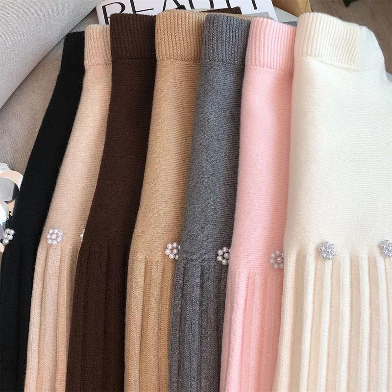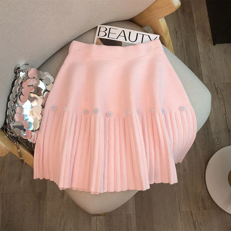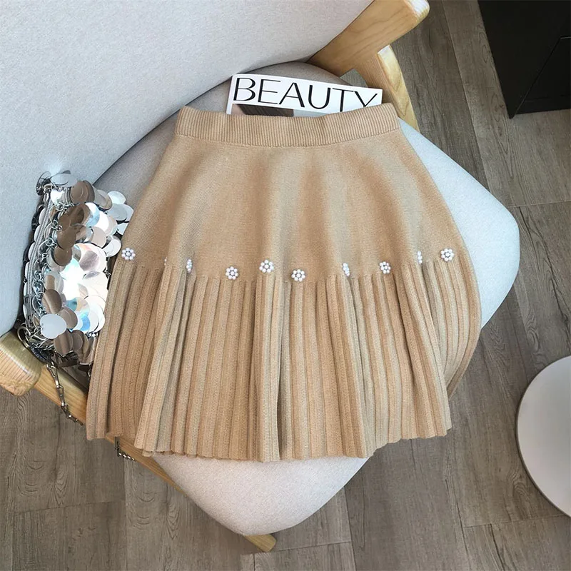 Dolce perla fiore decorare minigonna donna autunno inverno gonne a pieghe a vita alta lavorate a maglia gonne a trapezio coreane chic femminili
