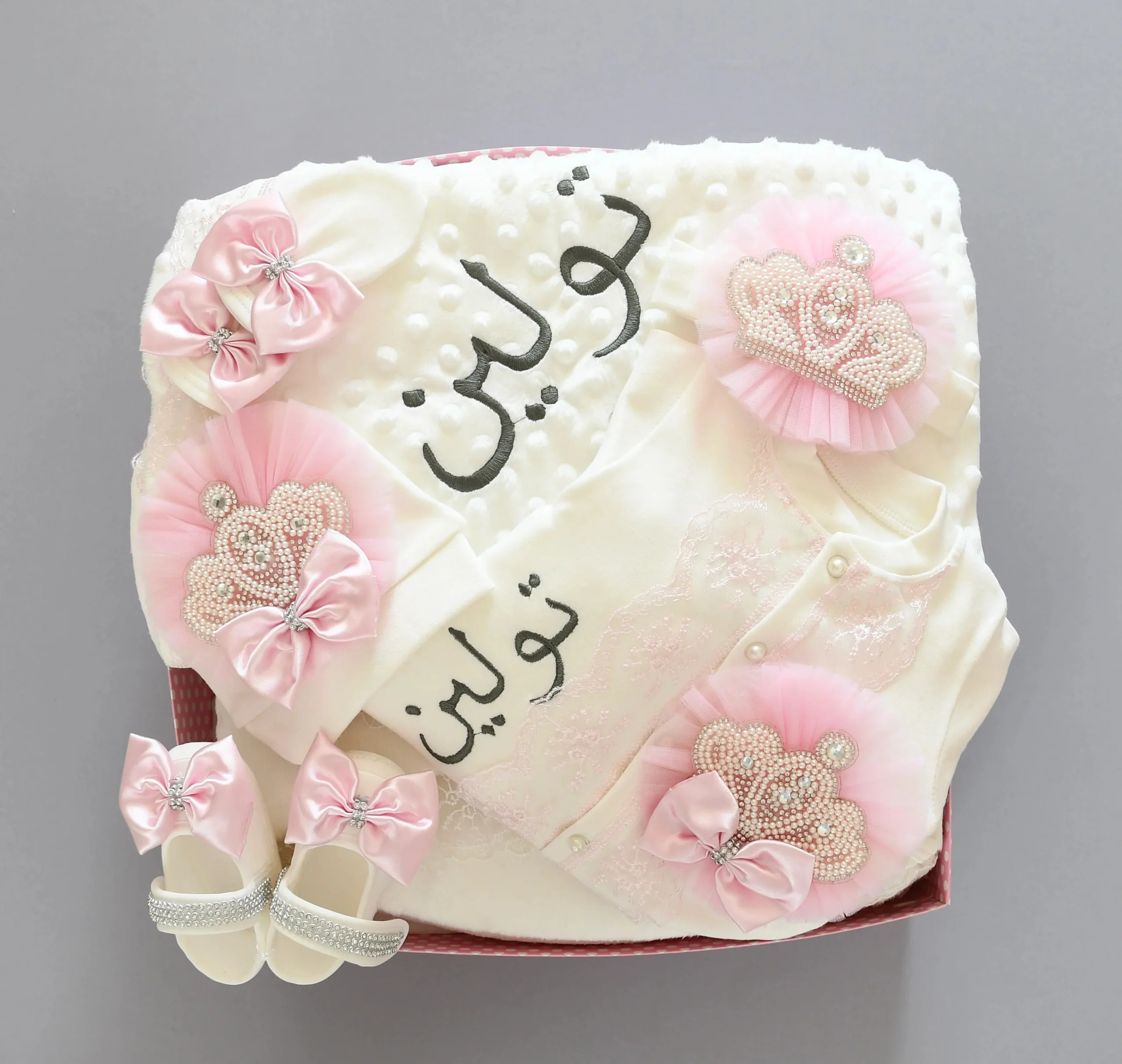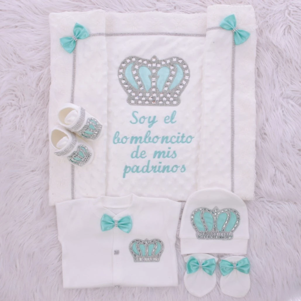 Product Description: Treat your little prince to this 5-pieces newborn take home set!!!! This luxury layette is made of softrich pink and white cotton. The Princess set is trimmed with delicate lace and embellished with thousands of rhinestones and gems. This is an heirloom quality piece that will be cherished by your family for generations. Our 5 pieces set is made up of soft, thick cotton. They are embellished with rhinestone buttons, crown jewels and bows. Each decorative detail is individually glued onto the onesie.