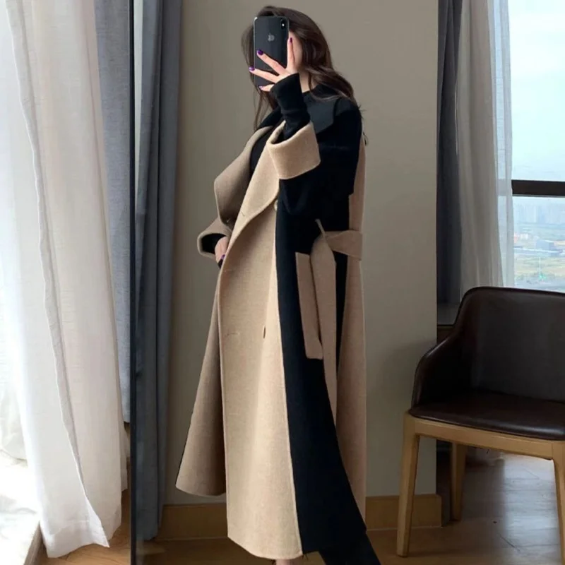 Donna Autunno Inverno Double-face POLIESTER Misto Stile lungo Elegante Patchwork Cappotto di lana High Street Slim Sash Capispalla