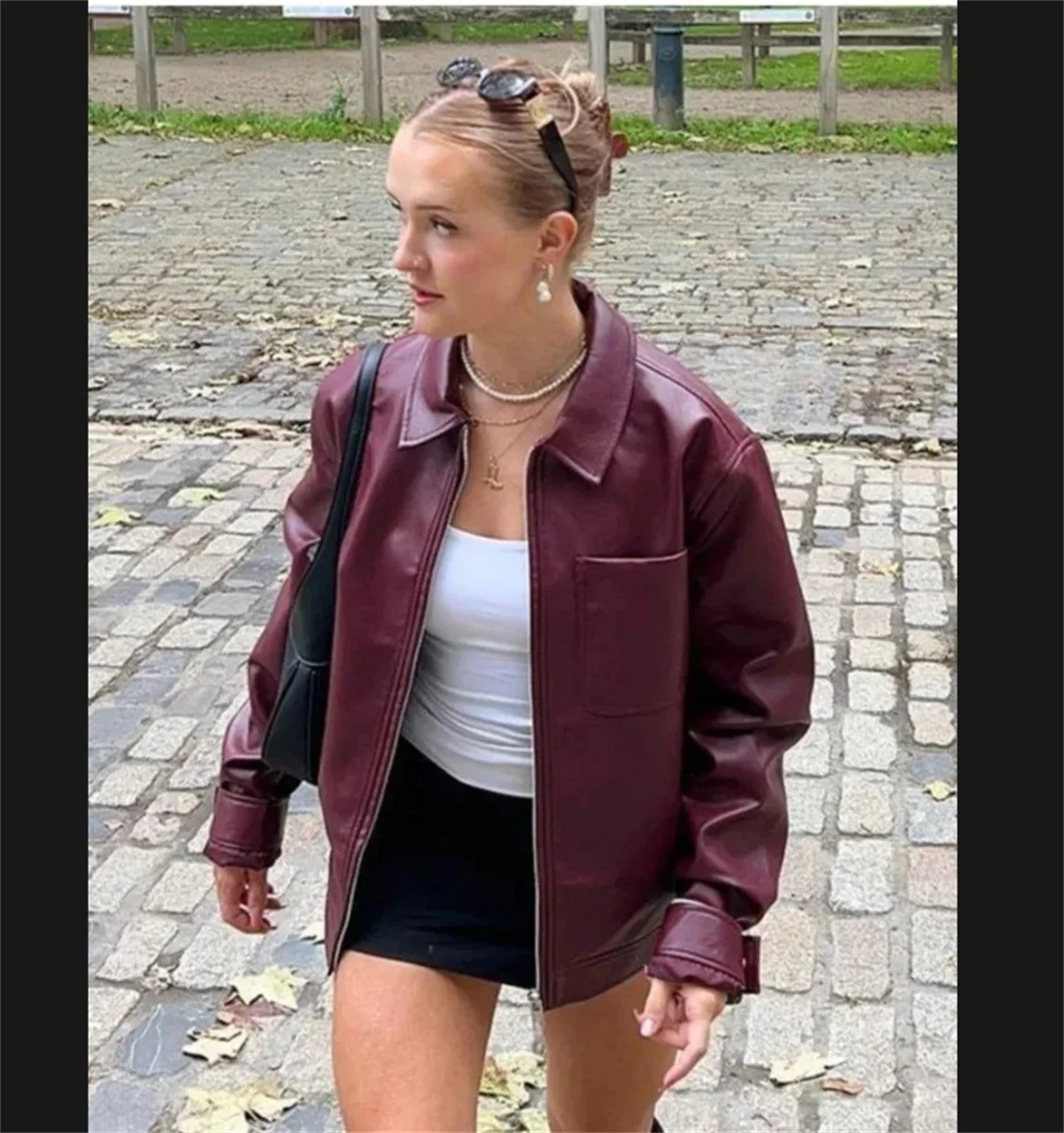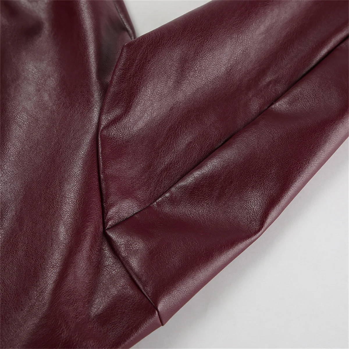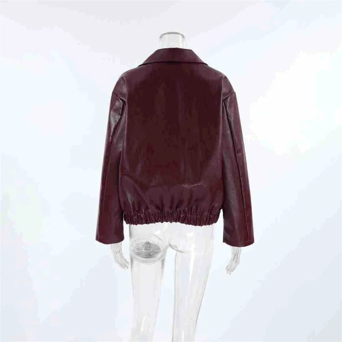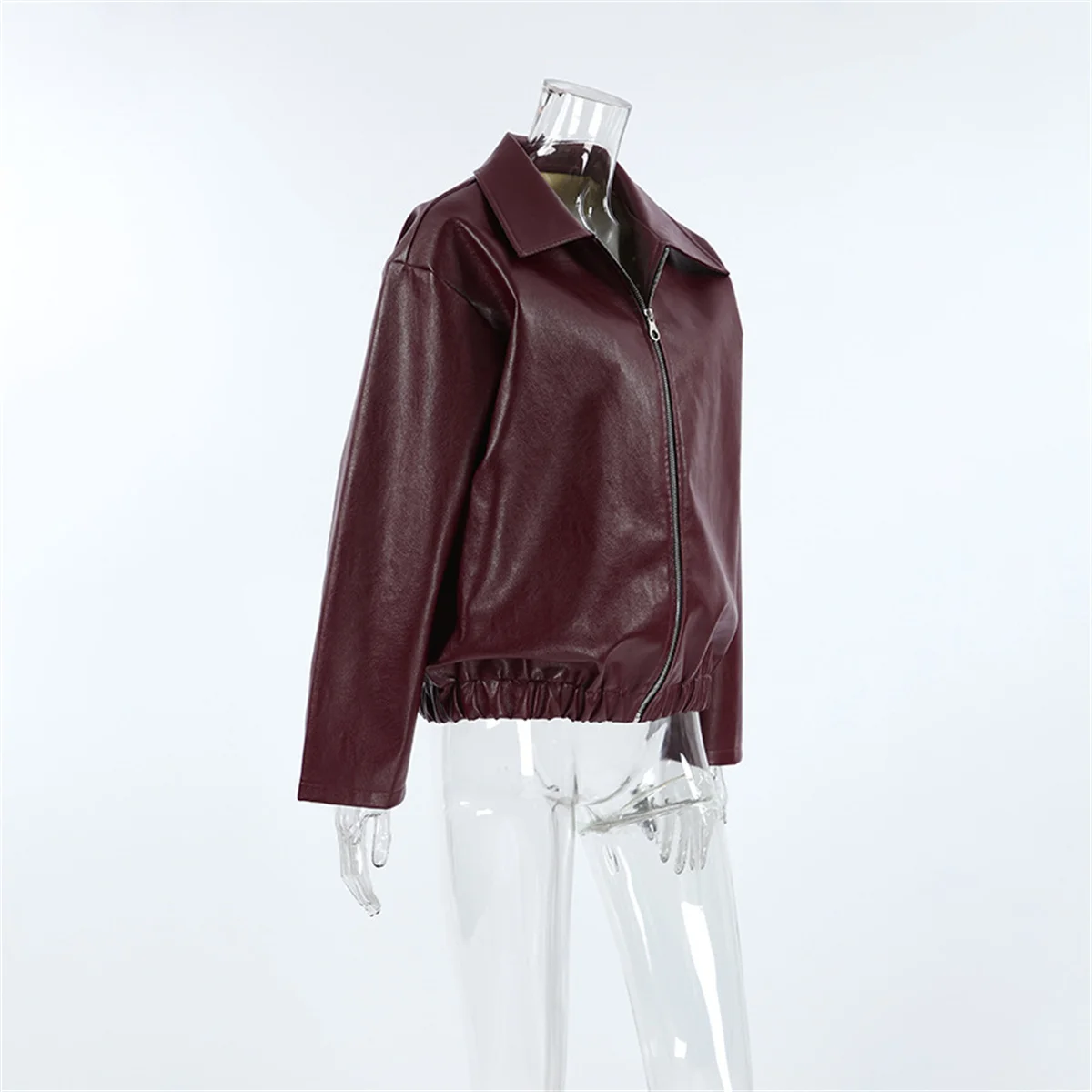 Donna Vintage Vino Rosso Ecopelle Jakcet Moda Tuta Sportiva Cerniera Risvolto Pu Cappotti Autunno Inverno Streetwear Donna Top corti