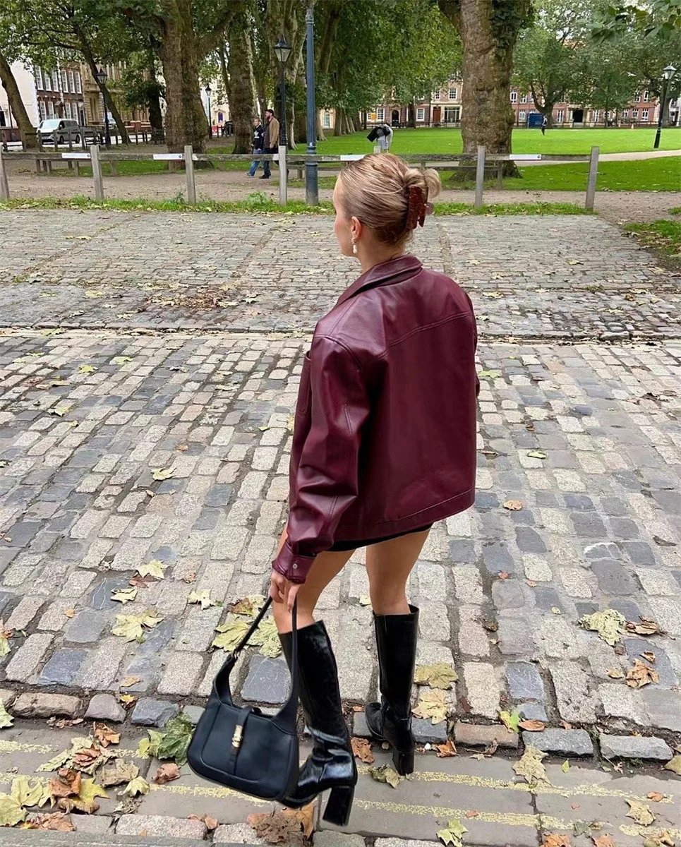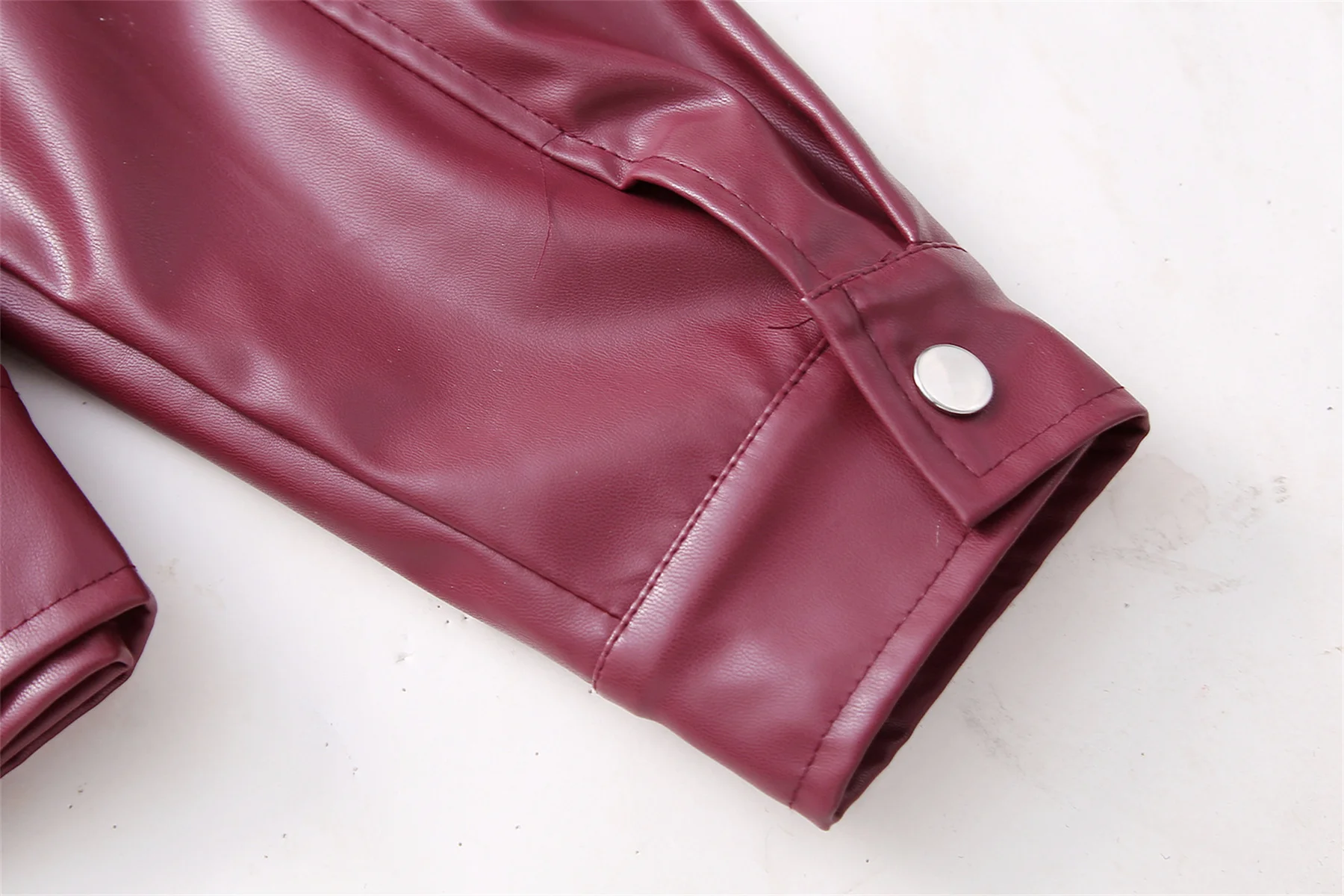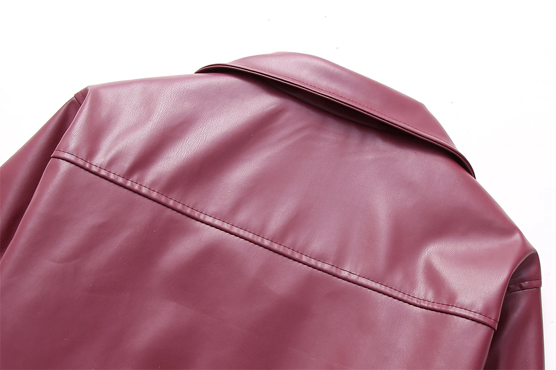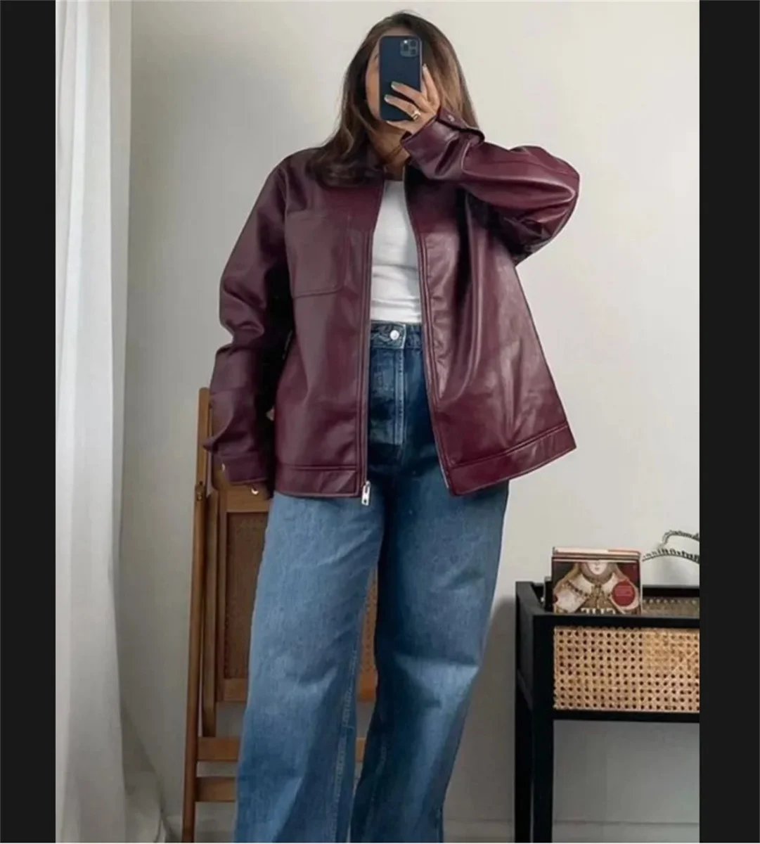 Donna Vintage Vino Rosso Ecopelle Jakcet Moda Tuta Sportiva Cerniera Risvolto Pu Cappotti Autunno Inverno Streetwear Donna Top corti