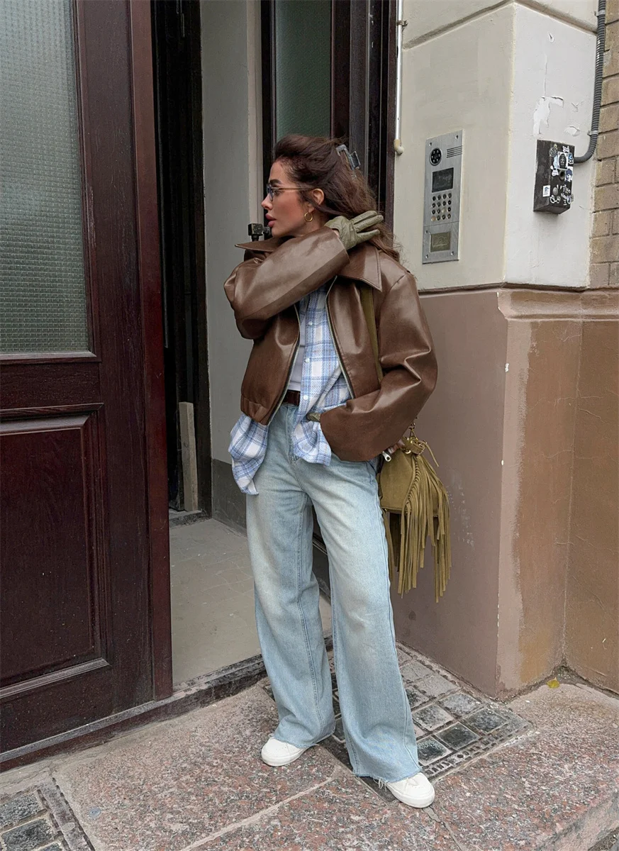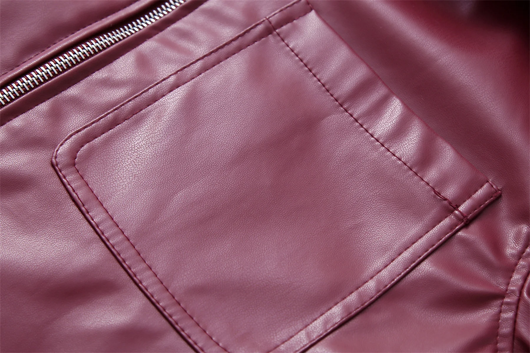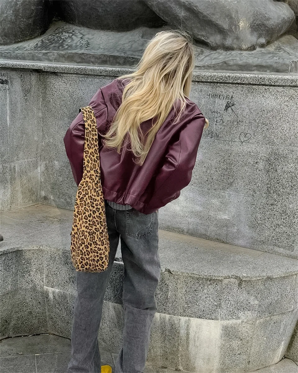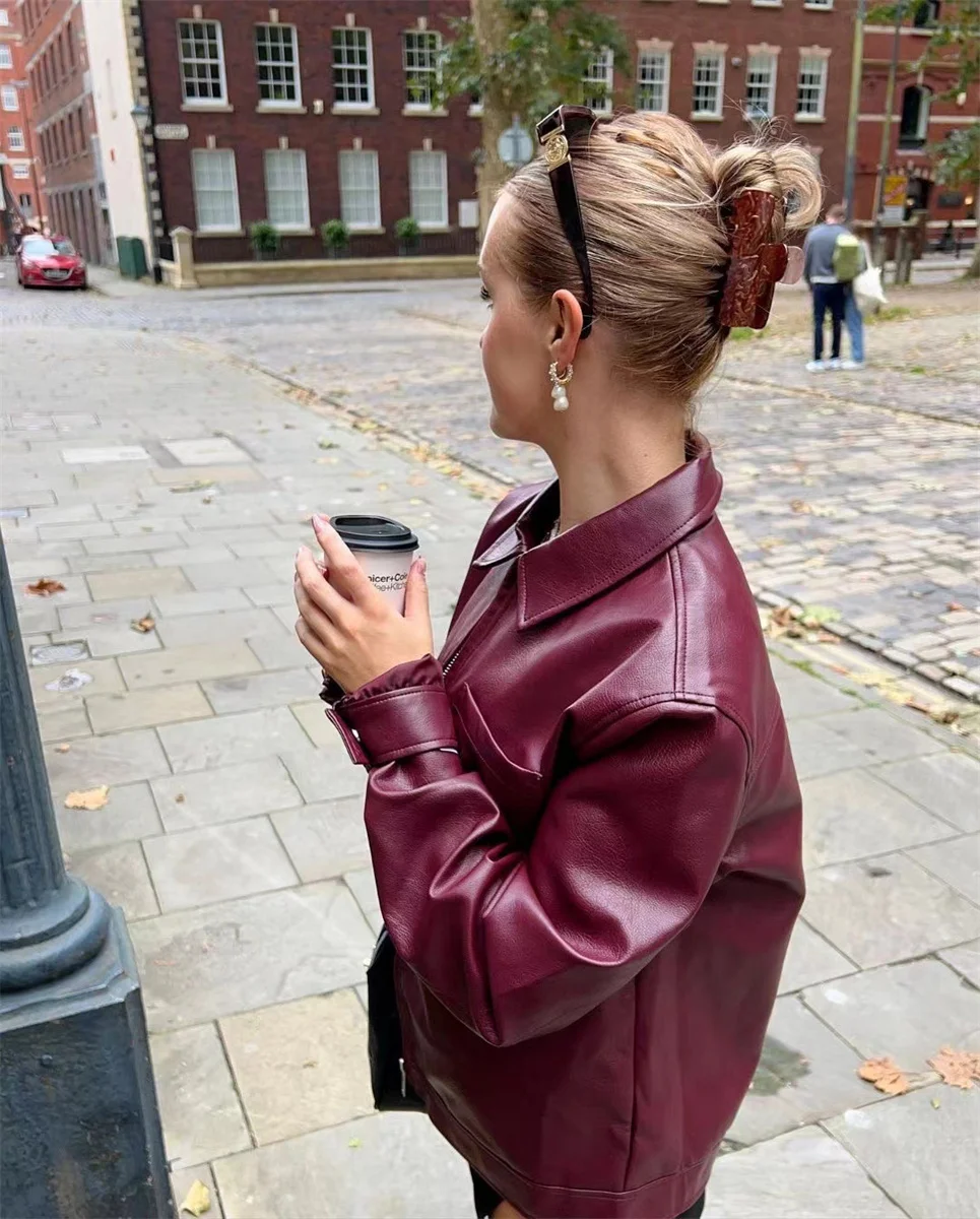 Donna Vintage Vino Rosso Ecopelle Jakcet Moda Tuta Sportiva Cerniera Risvolto Pu Cappotti Autunno Inverno Streetwear Donna Top corti