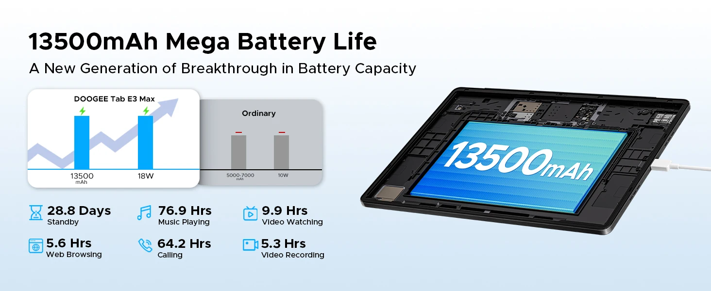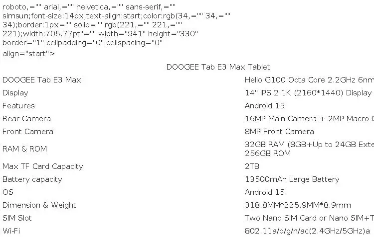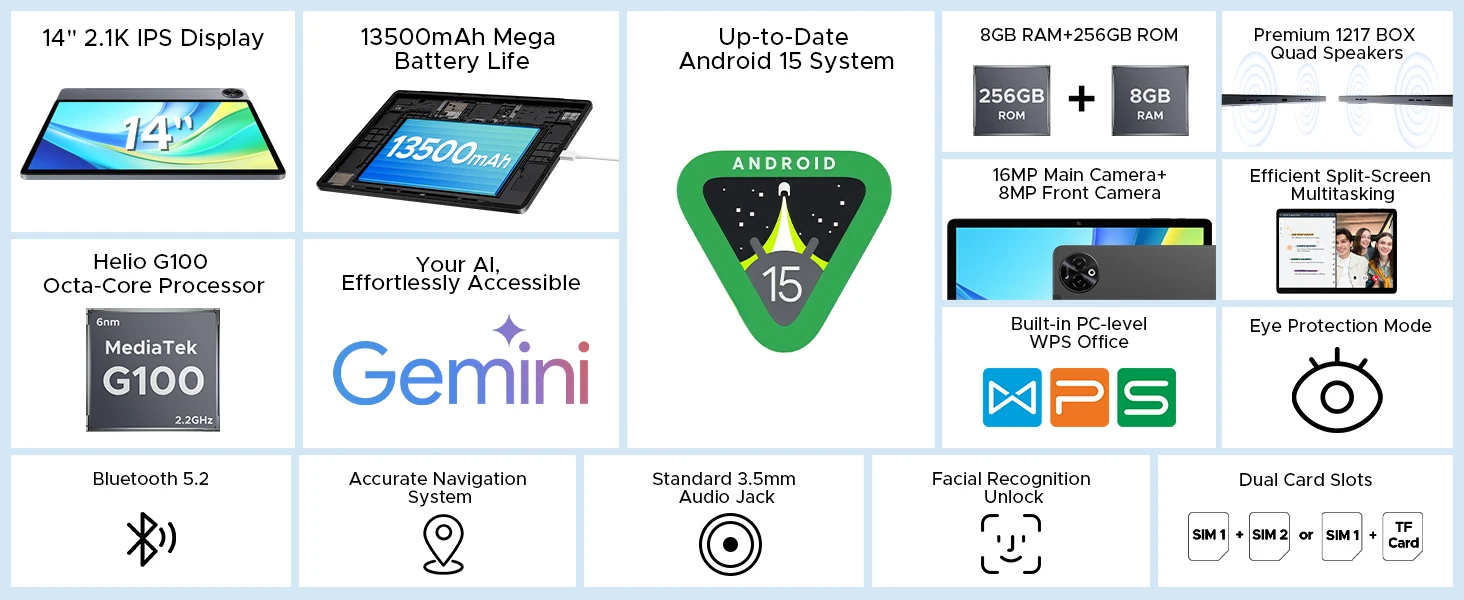 DOOGEE Tab E3 Max Tablet PC Android 15 Gemini AI Quad Altoparlanti Display 14” 2.1K 32GB(8+24) 256GB 13500mAh Batteria di grandi dimensioni