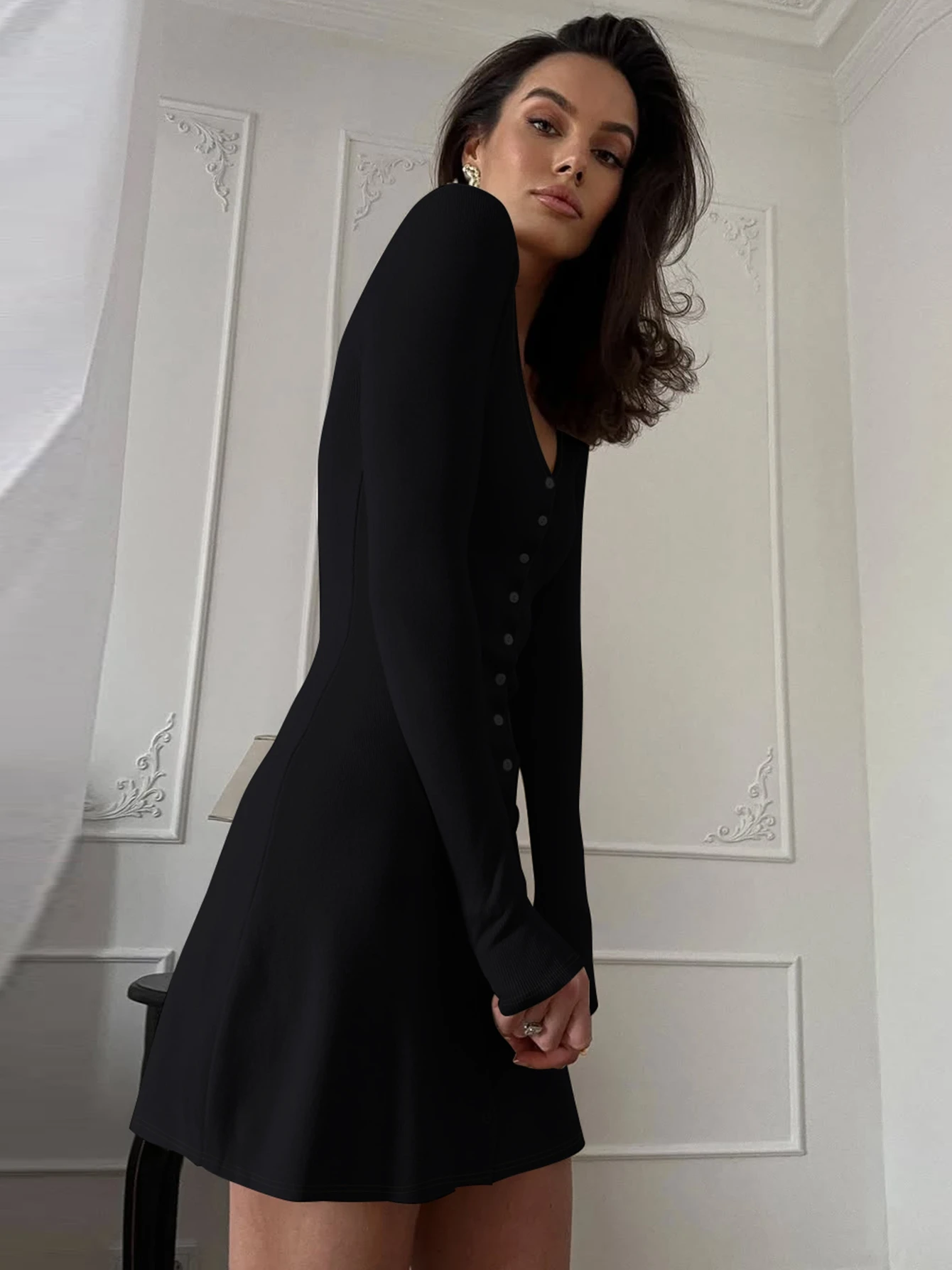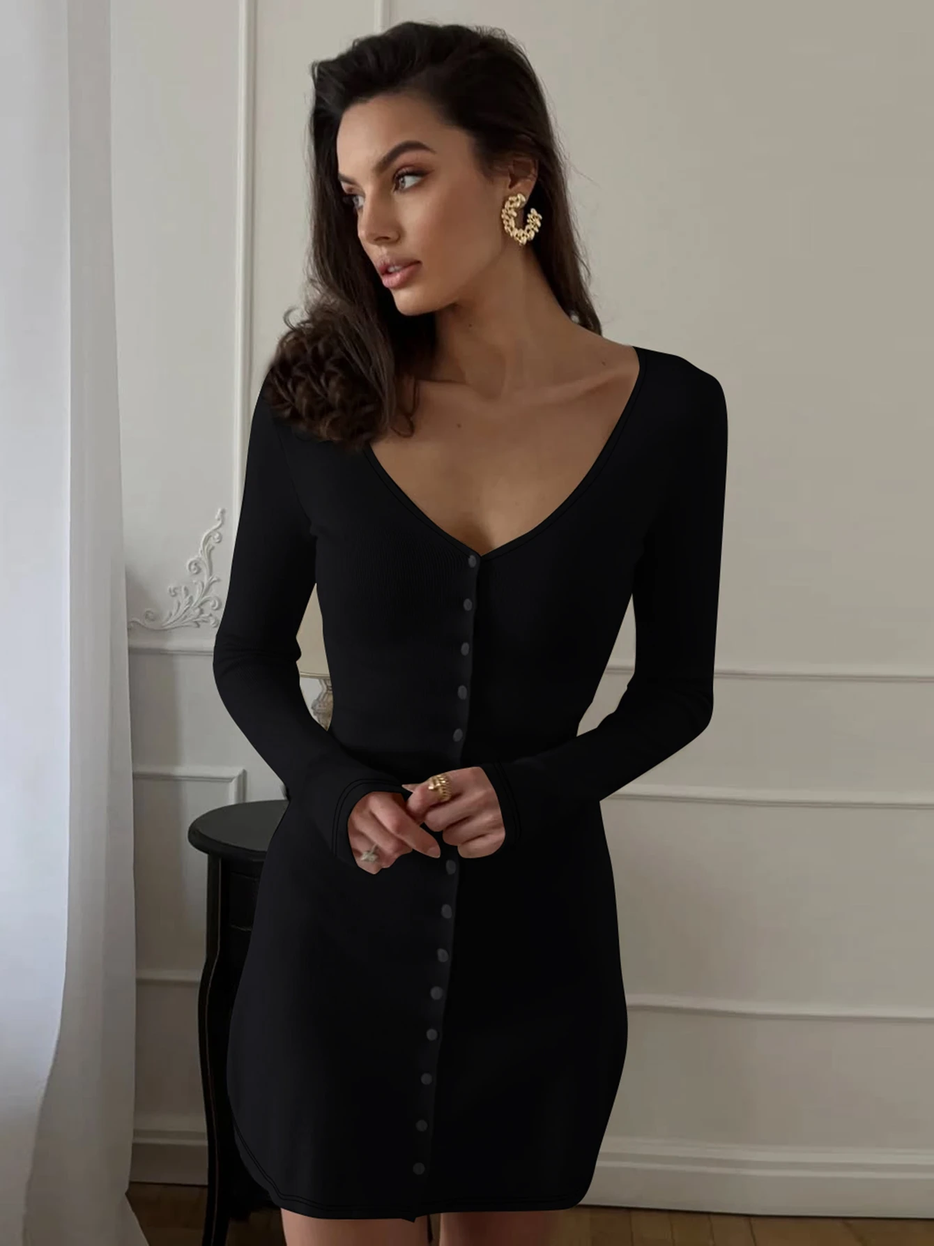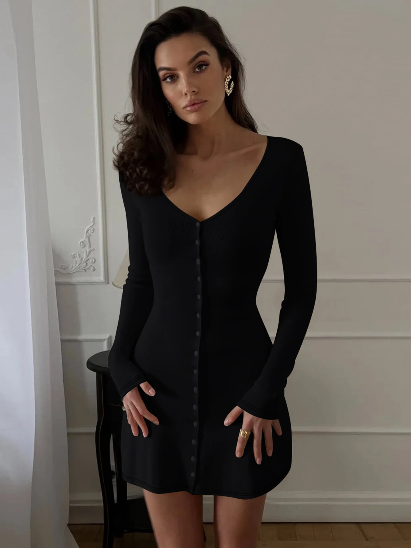 Dulzura 2025 Autunno Moda Sexy Con Scollo A V Manica Lunga Monopetto Sottile Mini Abito Solido Casual Vestito Delle Donne Del Partito Club Vestiti