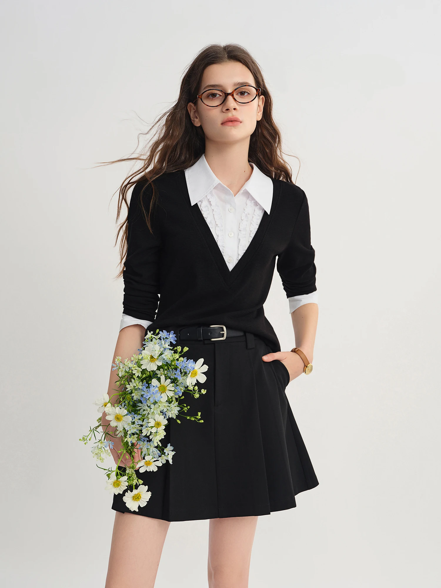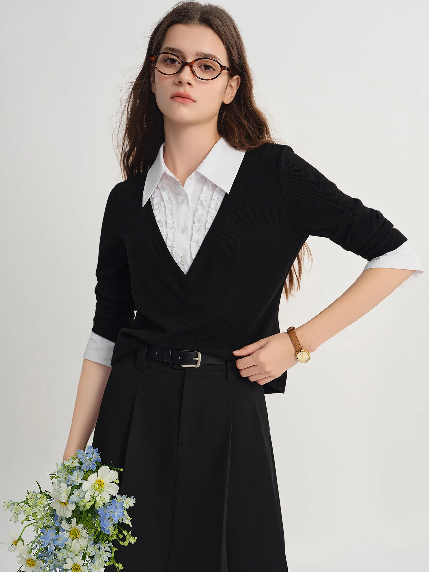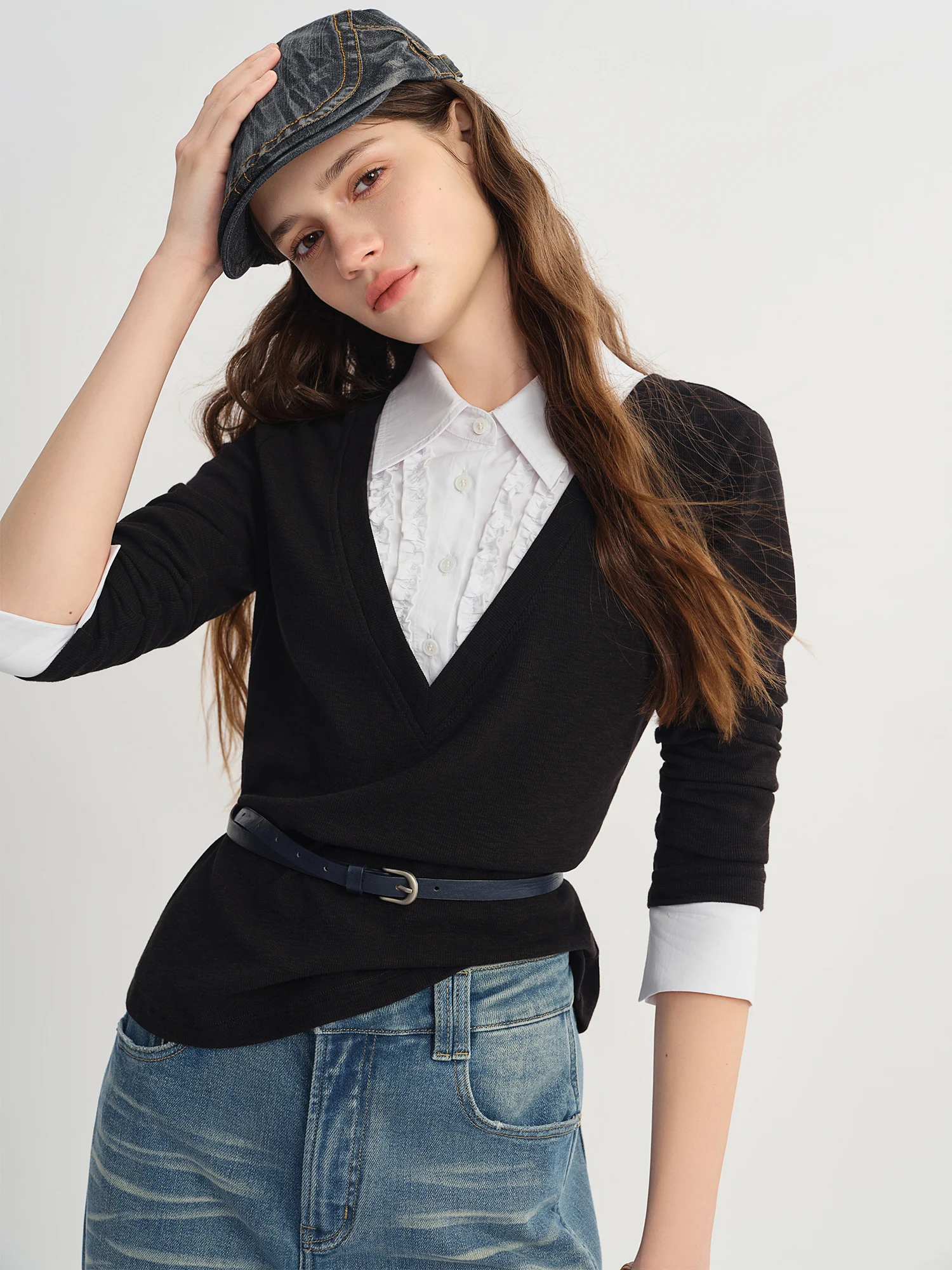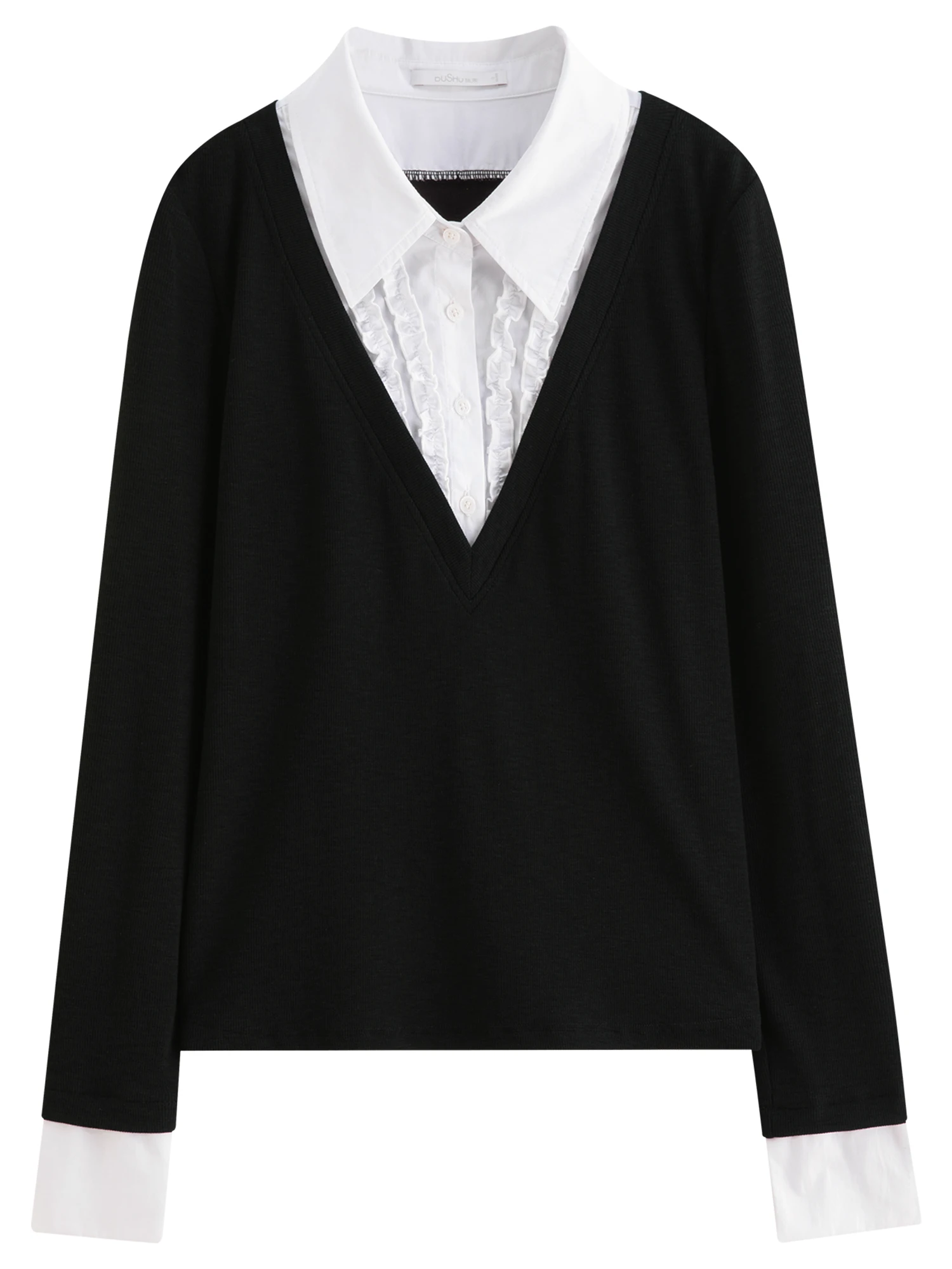 DUSHU Camicia patchwork a maniche lunghe in due pezzi finta da donna taglie forti 2025 Autunno Nuovo arrivo Pullover lavorato a maglia Moda Pendolarismo Top