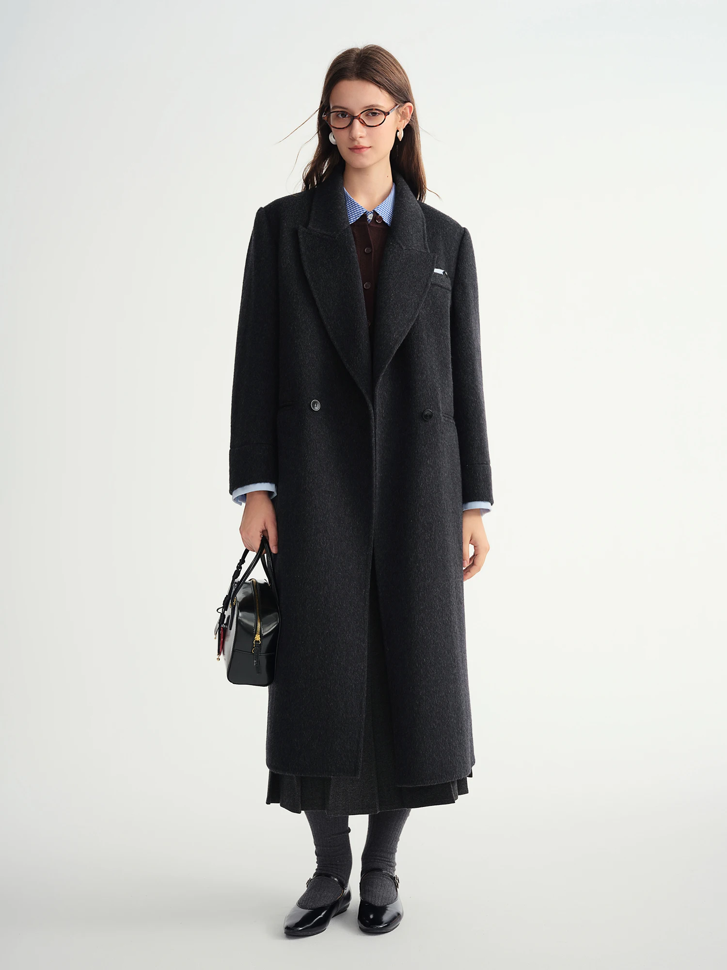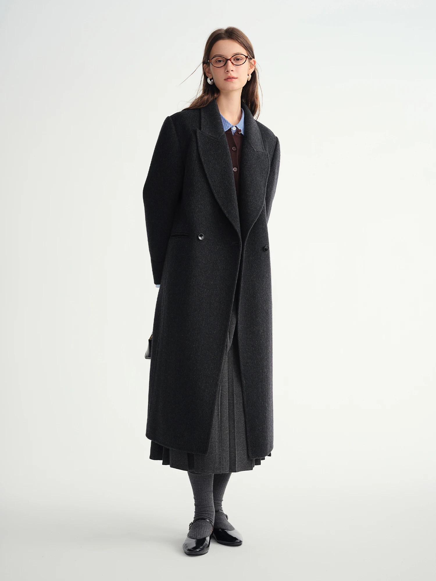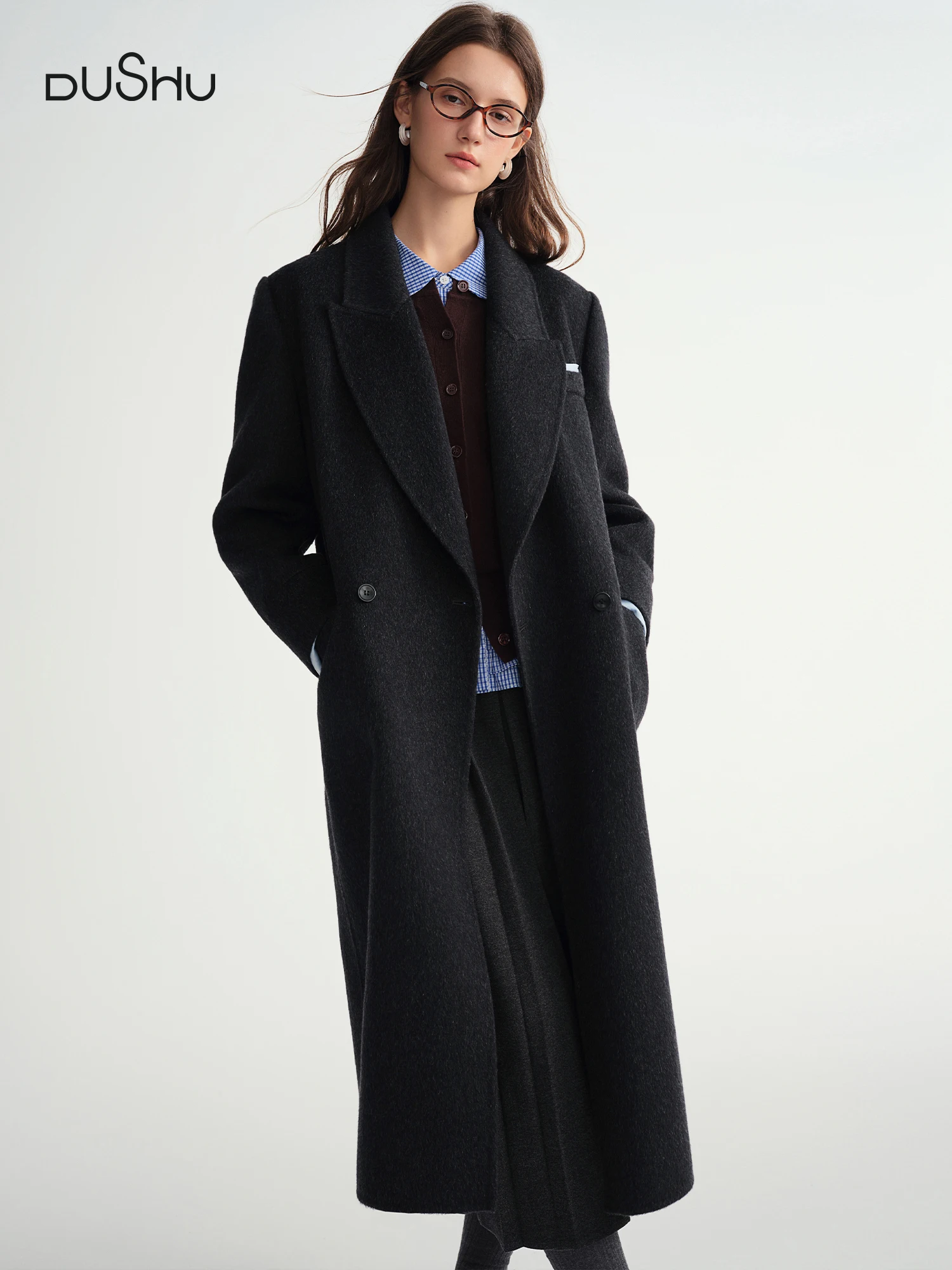 DUSHU Temperamento Colletto rovesciato Cappotto lungo di lana Spalla dritta Cappotto di pura lana Stile europeo Pendolarismo Elegante