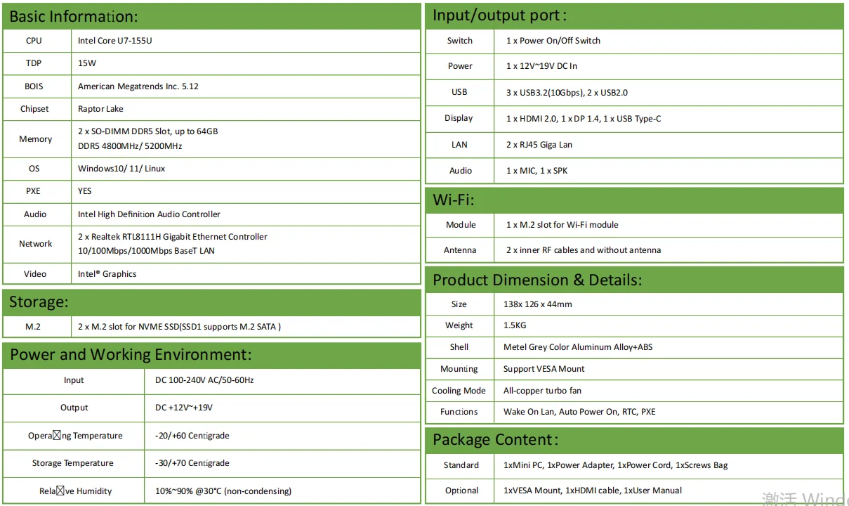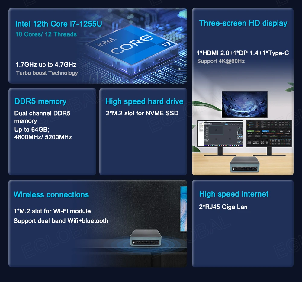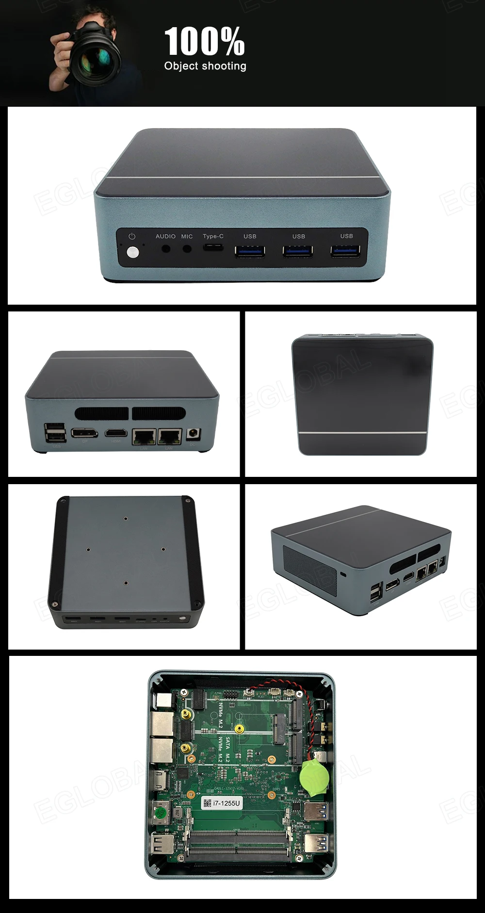 Eglobal Intel Mini PC Gamer Ultra5 125U Ultra7 155U 12 Core 2 * DDR5 2 * RJ45 Lan NVMe 5USB Win11 Desktop Mini Computer da gioco Wifi