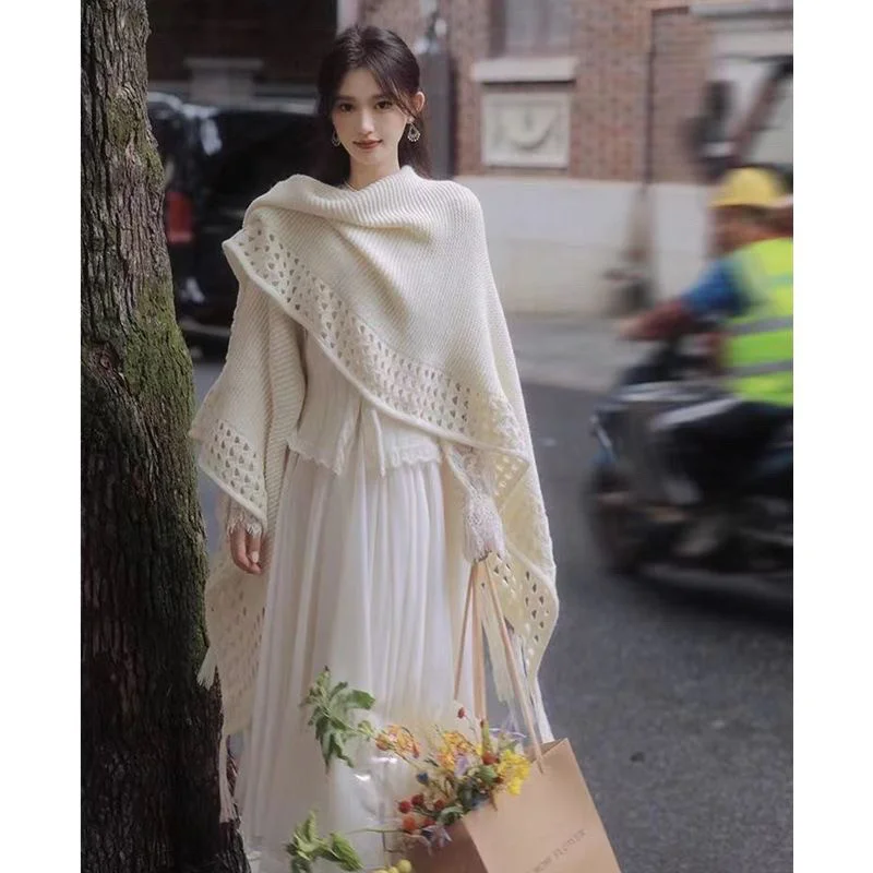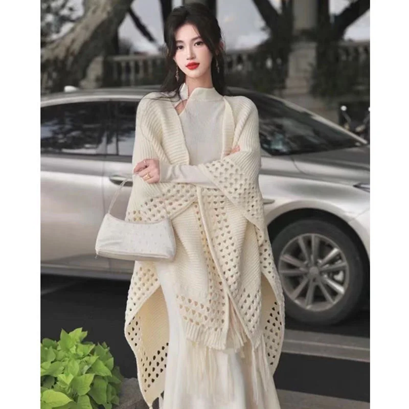 Elegant fur Ball Slimming High-end Knitted Shawl Jacket for Autumn Winter 2025 Solid ColorTourist Attraction Photography Style