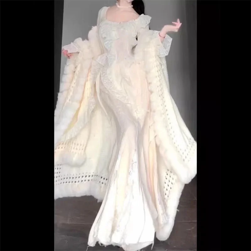 Mini abito elegante Abito longuette a maniche lunghe da donna Autunno e inverno Abiti bianchi casual con scollo a V alla moda in pizzo con ritaglio sfocato
